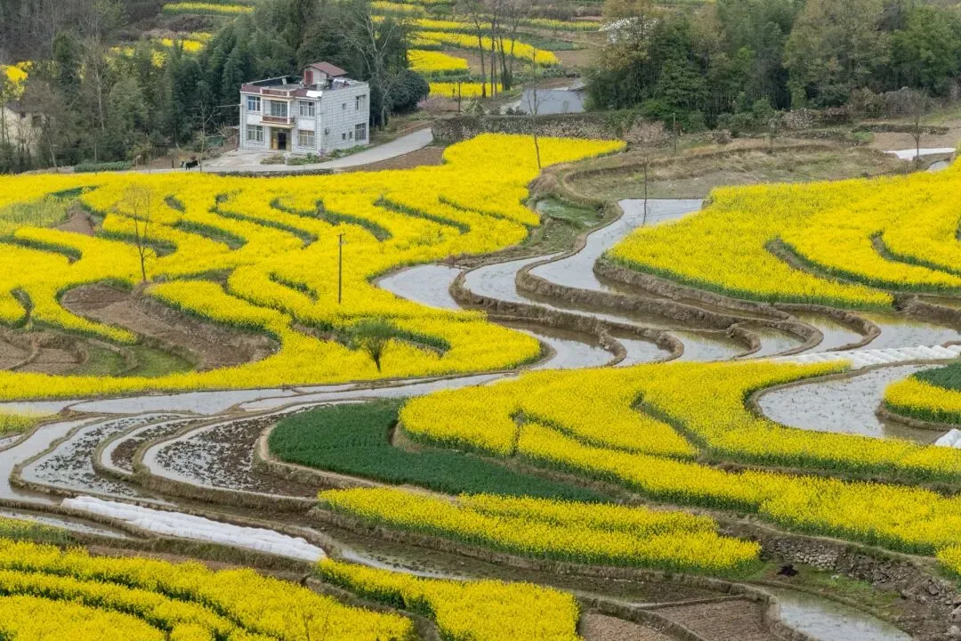 金色梯田:凤堰古梯田万亩油菜花盛放,层叠金浪直抵云端