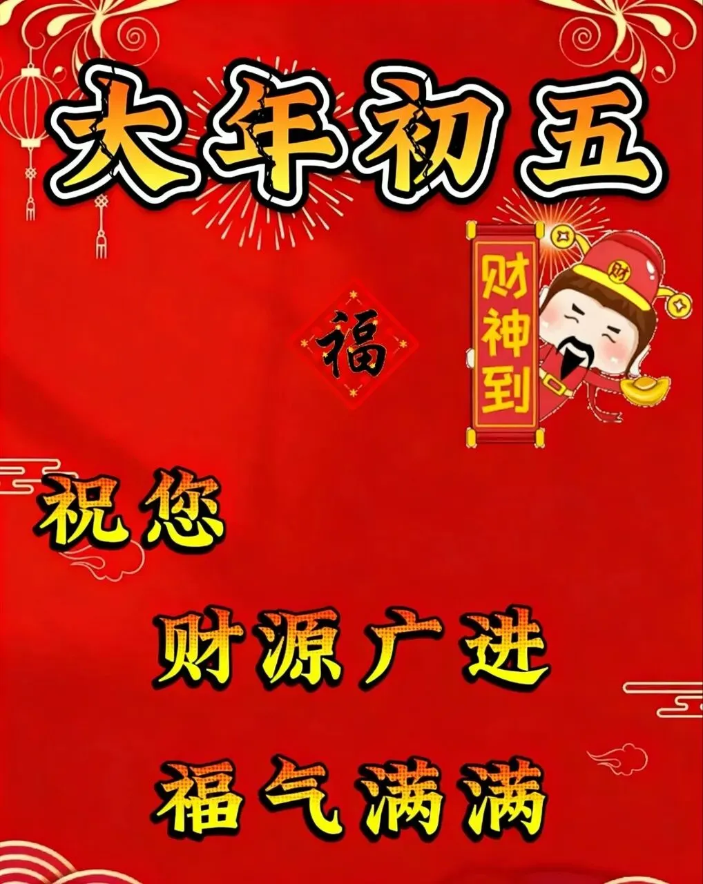 晨起开门迎财神,新年财源滚滚来。正月初五,祝你财通四海,五福临门,五谷丰登,五路来财,五方亨通,五喜盈门,富贵安康。