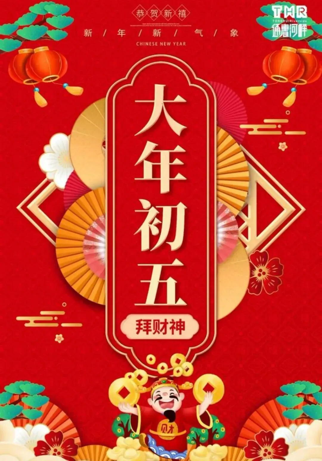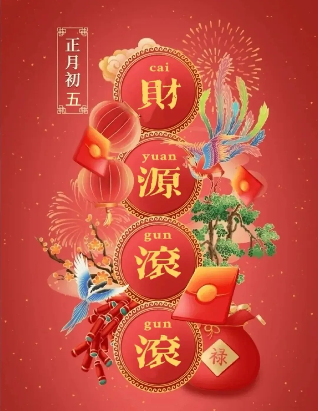 17.正月初五,财源广进。愿您的事业如日中天,财富如江水滔滔,家庭如春日温暖,身体如松柏常青,万事如意,心想事成。