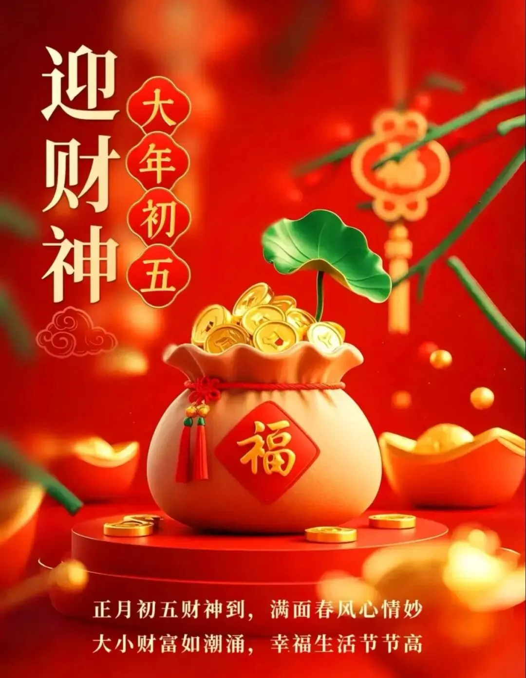 1. 正月初五迎财神,五路通达聚宝盆。愿您开门纳福,把四面八方的财运请进家门,从此金银满屋,富贵盈门,财源滚滚不停歇。