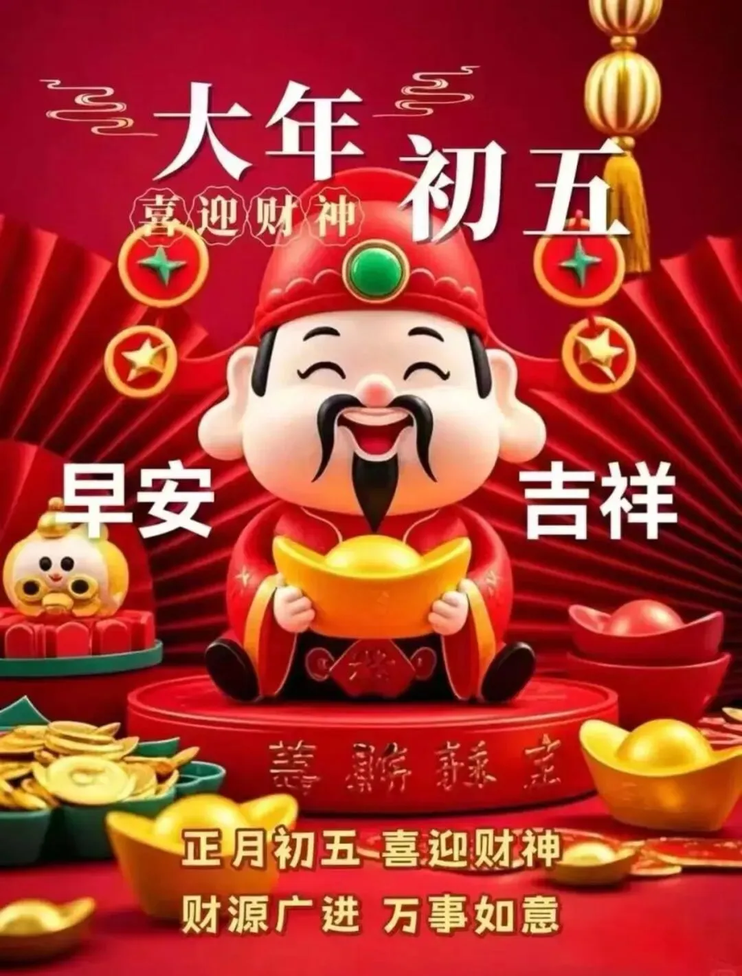 3..初五财神到,金银财宝往家跑。愿您在新的一年里,赚钱不费力,花钱不心疼,存钱有惊喜,理财有高招,富贵安康乐逍遥。