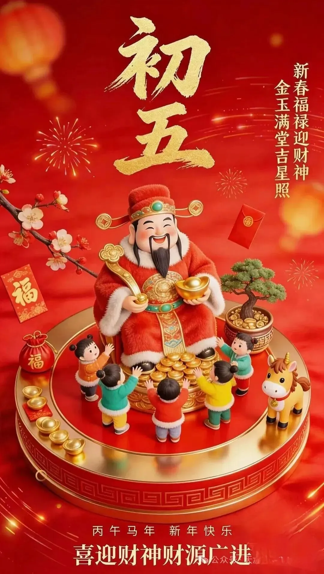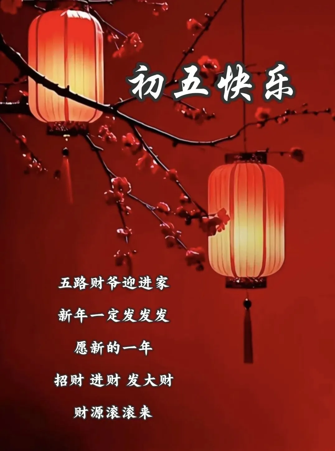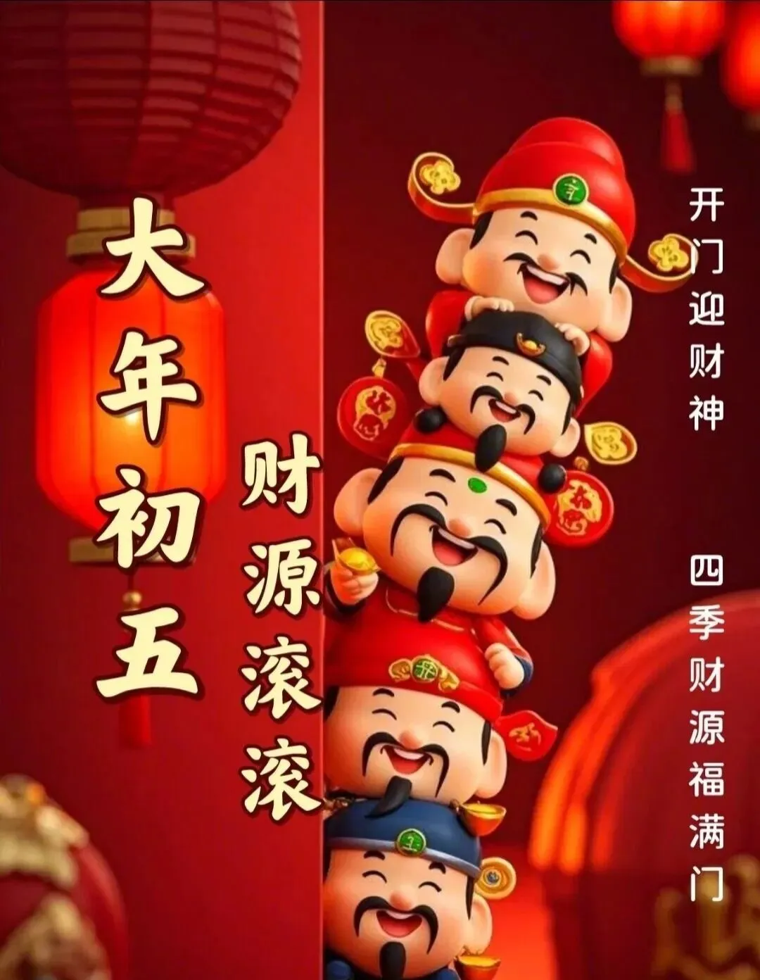 3. 正月初五的祥云朵朵,载着五路财神的厚礼降临人间☁️ 周六的街头挂起红灯笼,烟火气里全是吉祥味🏮 东路财星引路,西路福神护航,愿你正财稳赚,偏财不断,兜里有钱,心中有光,周末欢喜,全年顺遂💰🎉🍎