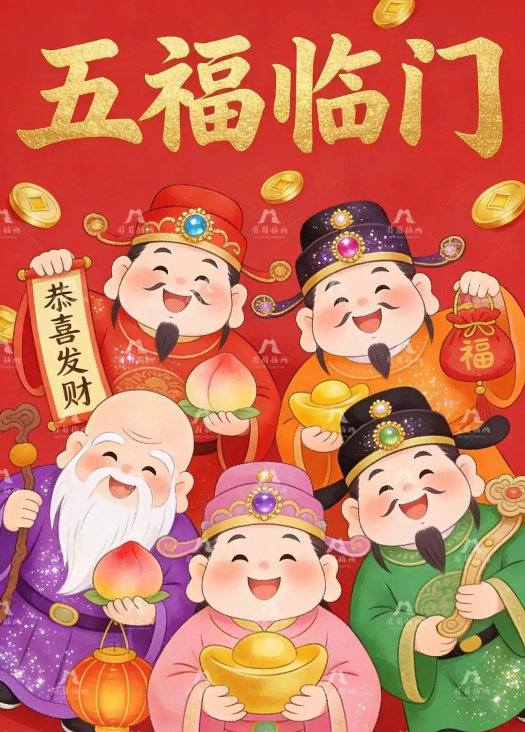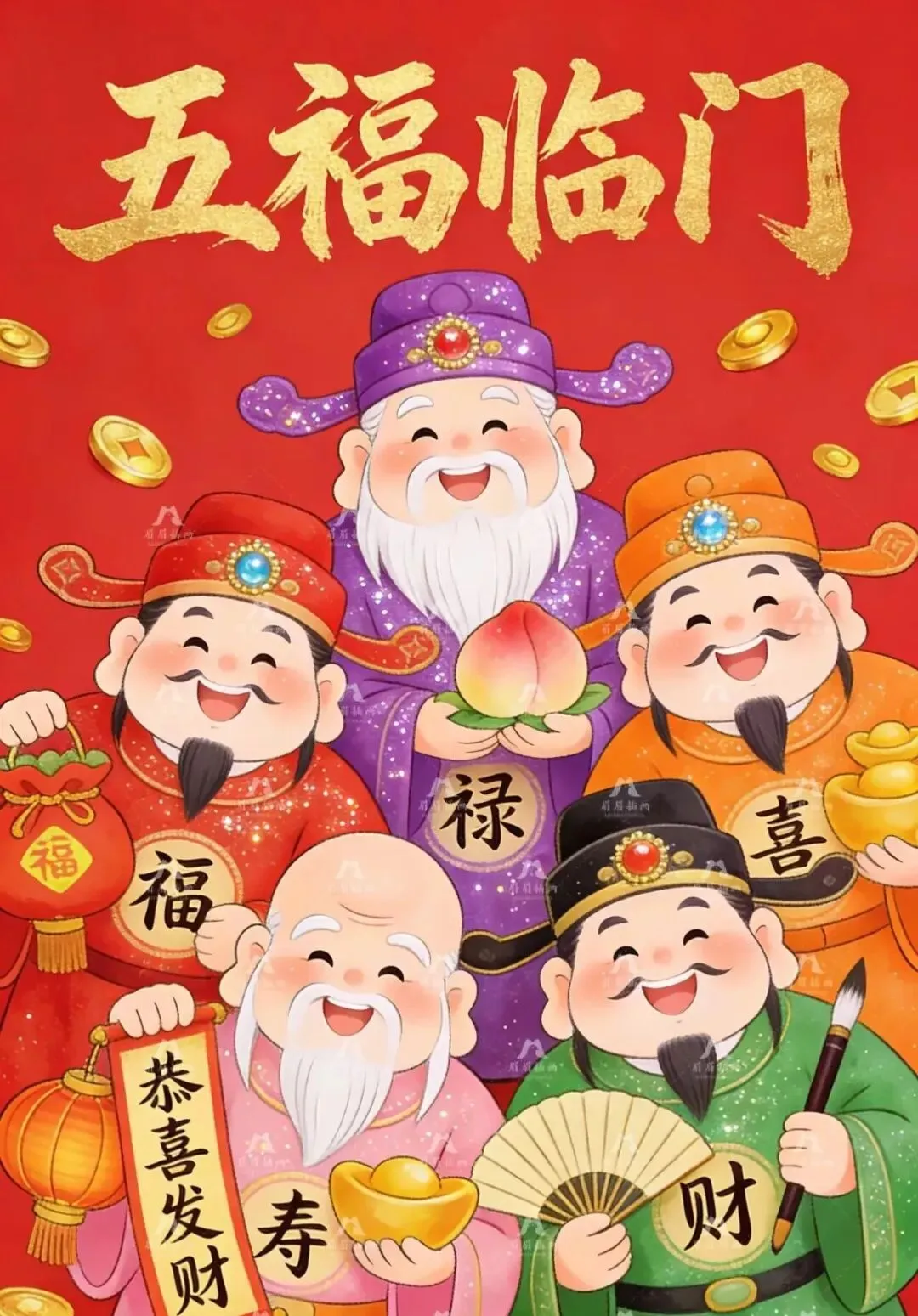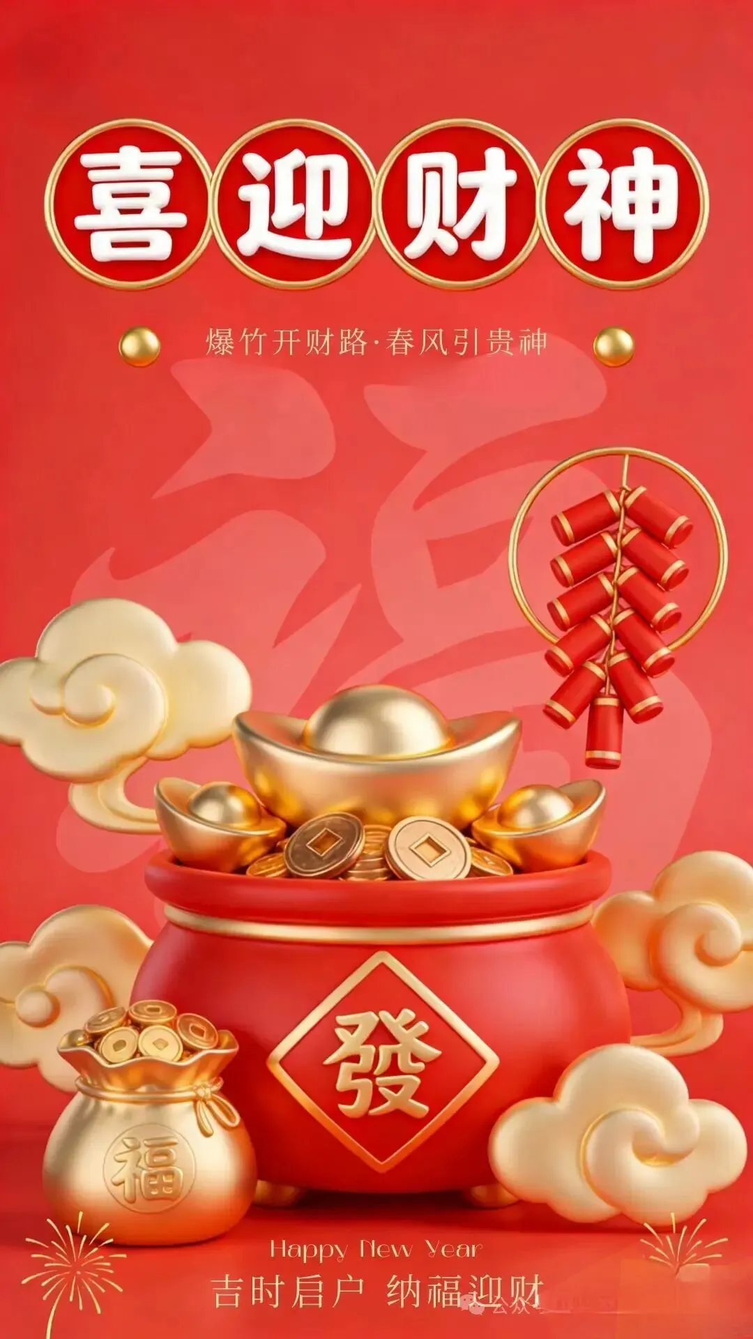 3. 正月初五的祥云朵朵,载着五路财神的厚礼降临人间☁️ 周六的街头挂起红灯笼,烟火气里全是吉祥味🏮 东路财星引路,西路福神护航,愿你正财稳赚,偏财不断,兜里有钱,心中有光,周末欢喜,全年顺遂💰🎉🍎