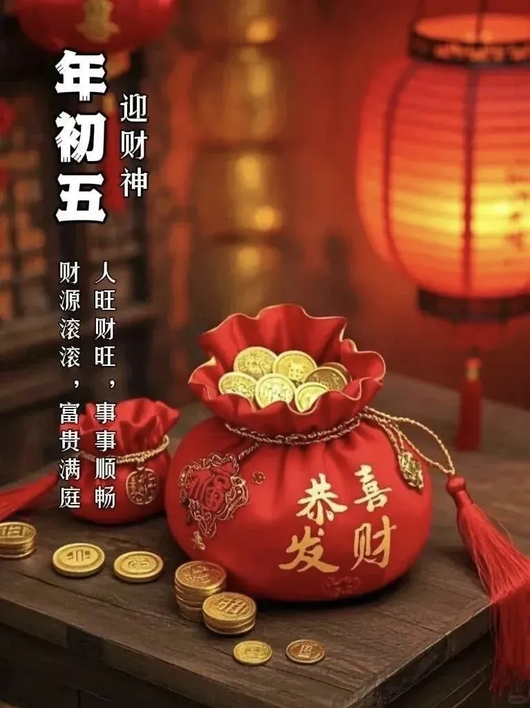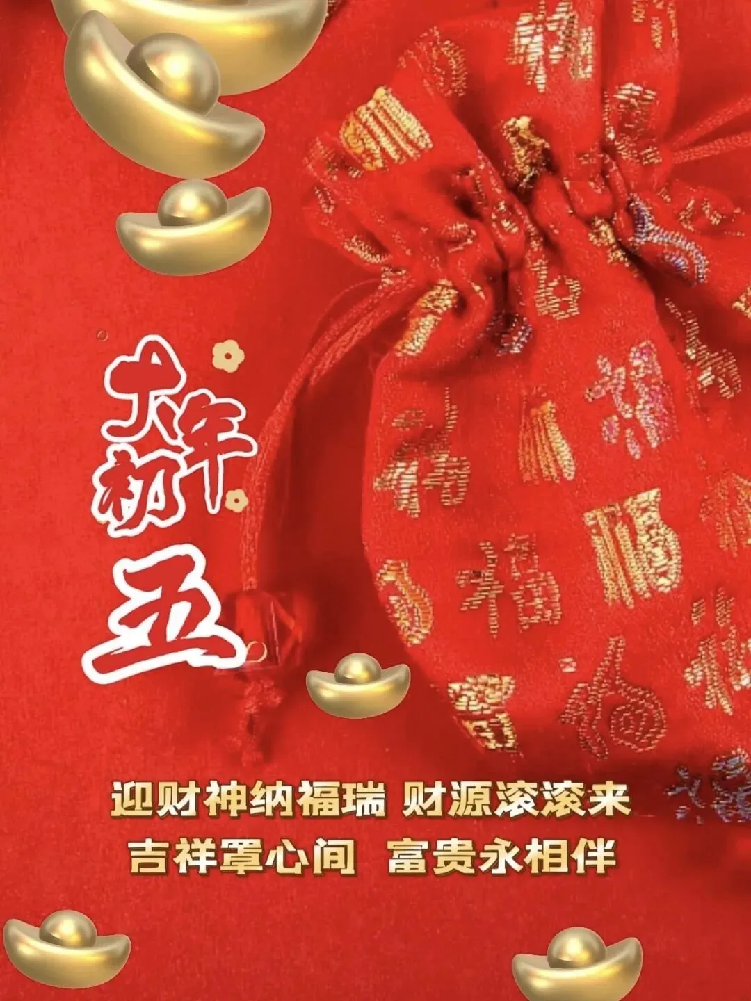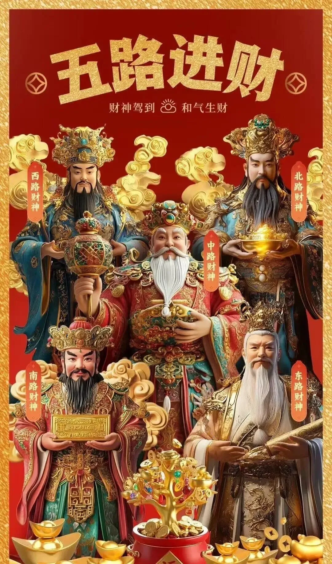 10. 祥龙昂首,正月初五的财气裹着周六的微风拂过脸颊🐉 挂上祈福的中国结,恭迎五路财神进门🏮 愿东路的正财稳稳当当,西路的偏财惊喜连连,南路的横财偶尔降临,北路的财库满满当当,中路的财气直冲云霄💰🎉✨