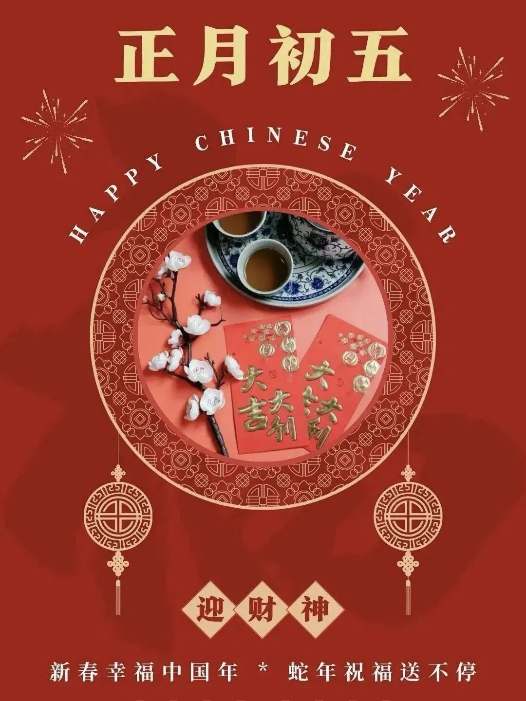 8. 正月初五,五路财神齐驾到,财气铺满周六的每一寸时光💰 折一枝梅花插在瓶里,添一份雅致,迎一份福运🌸 东路招财,西路纳珍,愿你不管是奔波事业,还是享受周末,都能被财气眷顾,烦恼清零,福气满盈🧧☕✨