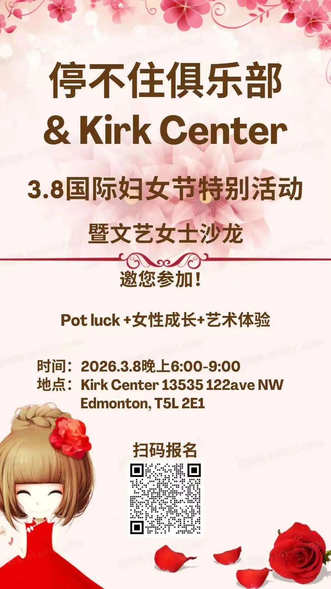 农历马年春节刚过,一年一度的3.8国际女神节,即将来临。在这个专属于女性的节日里,让我们放下繁忙的日常,走进艺术的殿堂。由停不住俱乐部和Kirk Center 倾情主办,这场集艺术体验、美食分享与心灵交流于一体的大型 Potluck 聚会,诚邀每一位爱生活的您参加!
