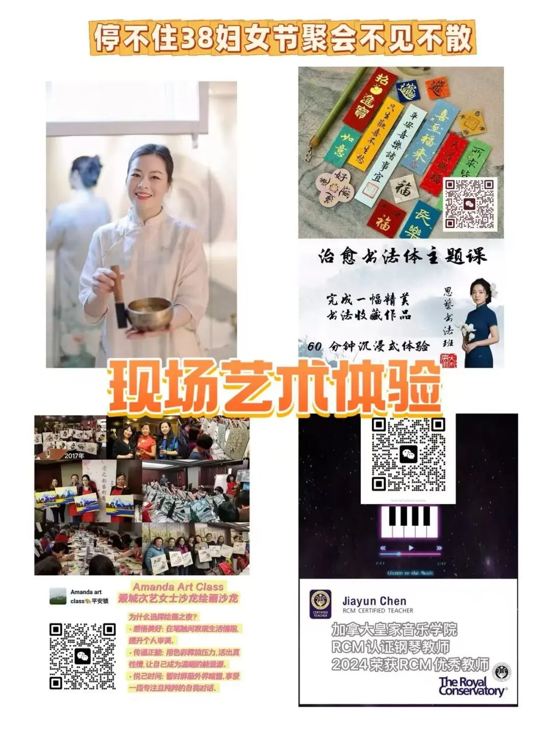 零基础女士艺术课体验: 绘画、书法、琴韵、瑜伽、艺术疗愈、插花艺术。多位资深老师现场指导,面对面开启你的艺术之门。