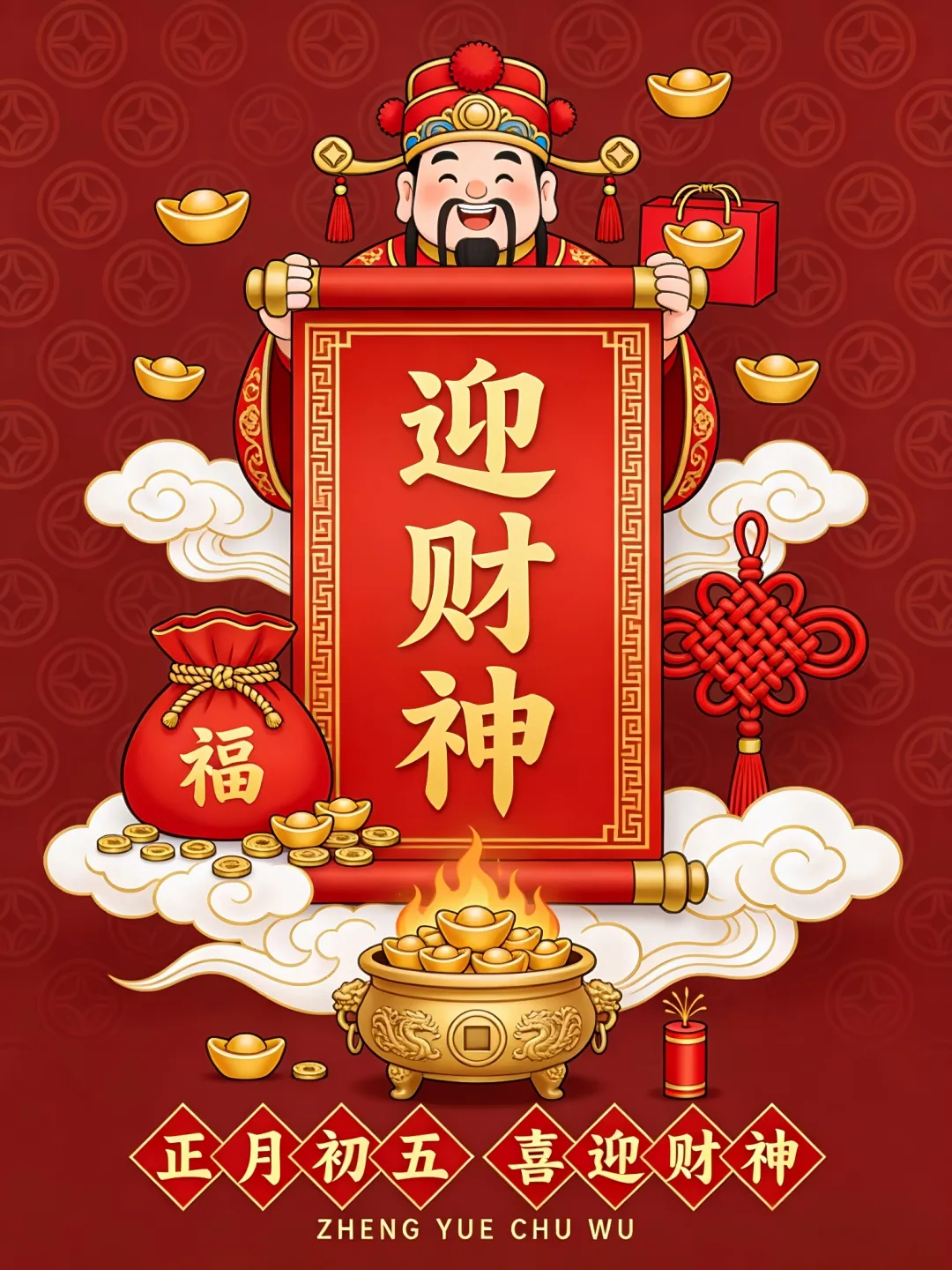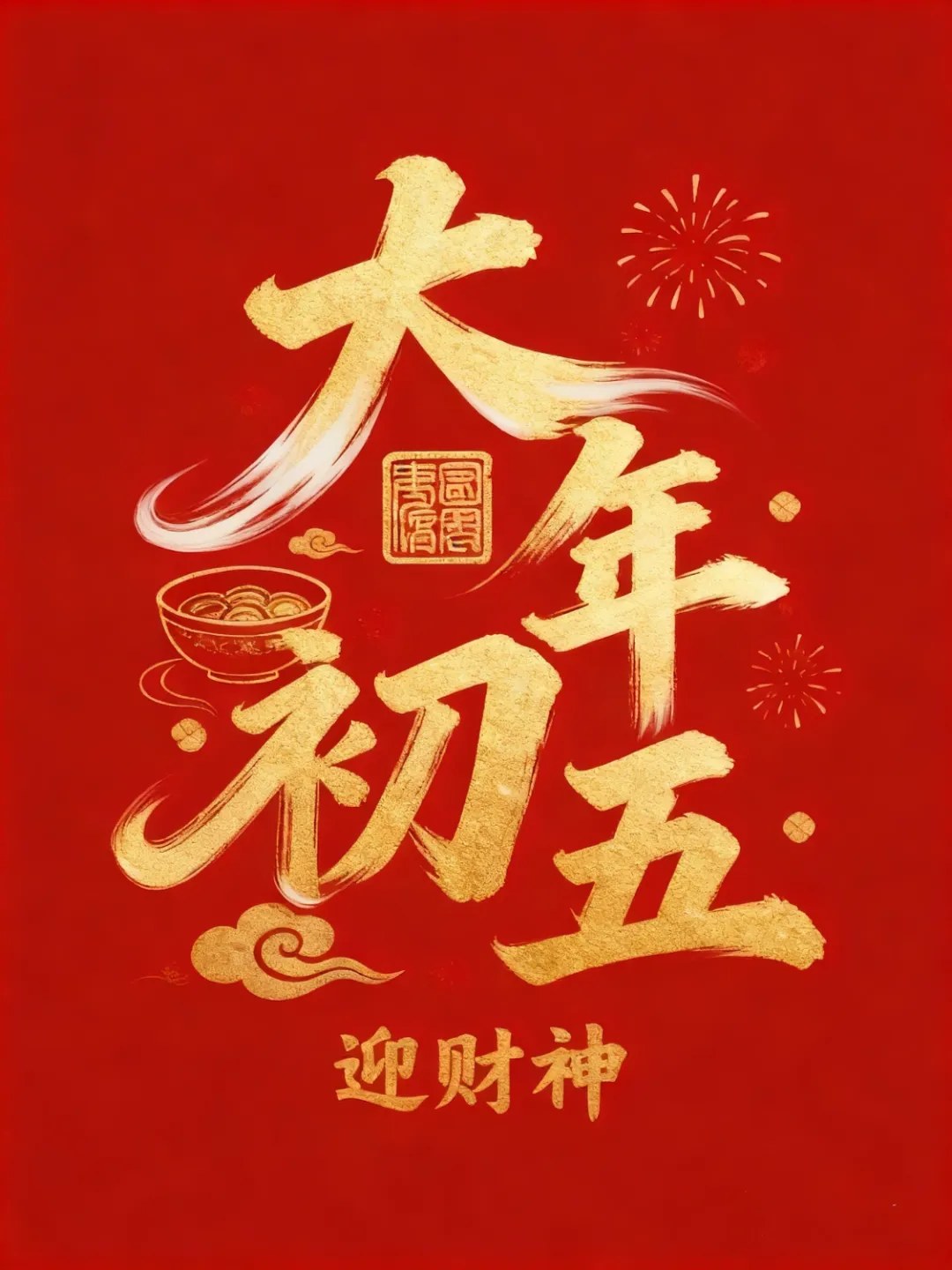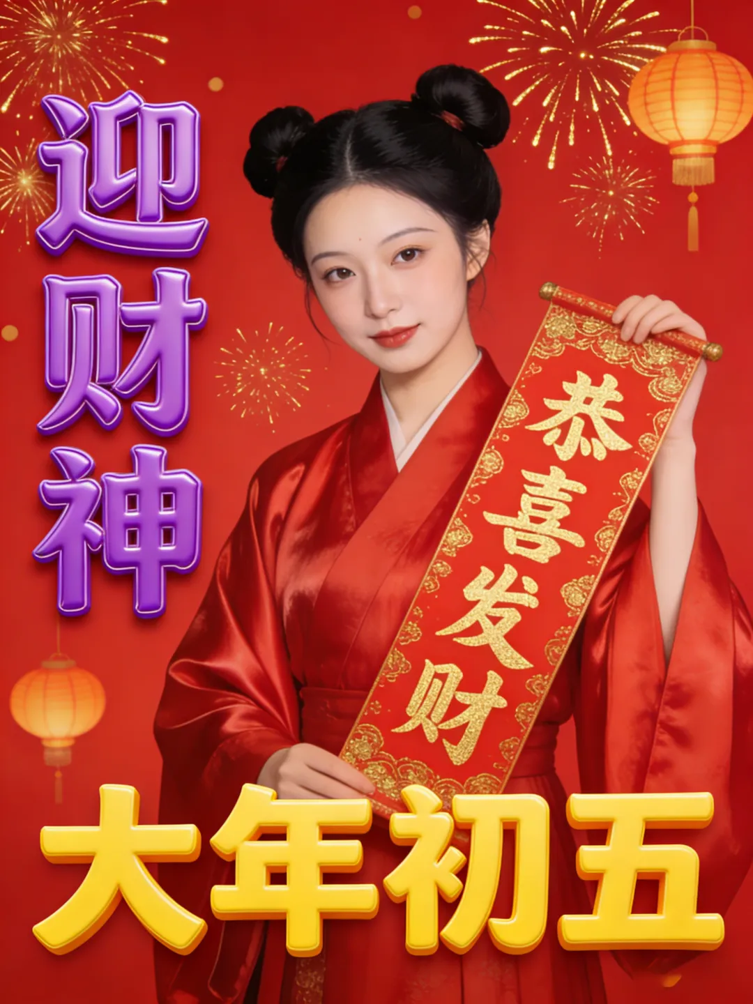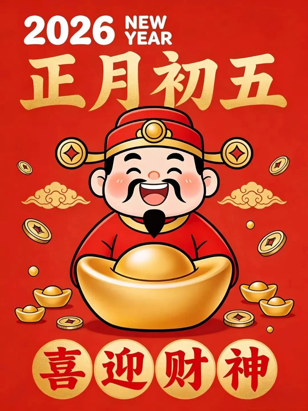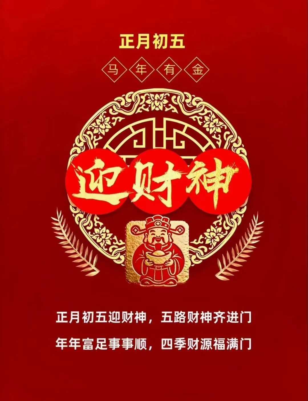正月初五-迎财神,家家户户财源滚,祝大家大财小财,财从四面八方来,𝟮𝟬𝟮𝟲丙午马年,愿大家手中有财,心中有光,脚下有路,策马扬鞭,奔赴属于自己的锦绣前程!