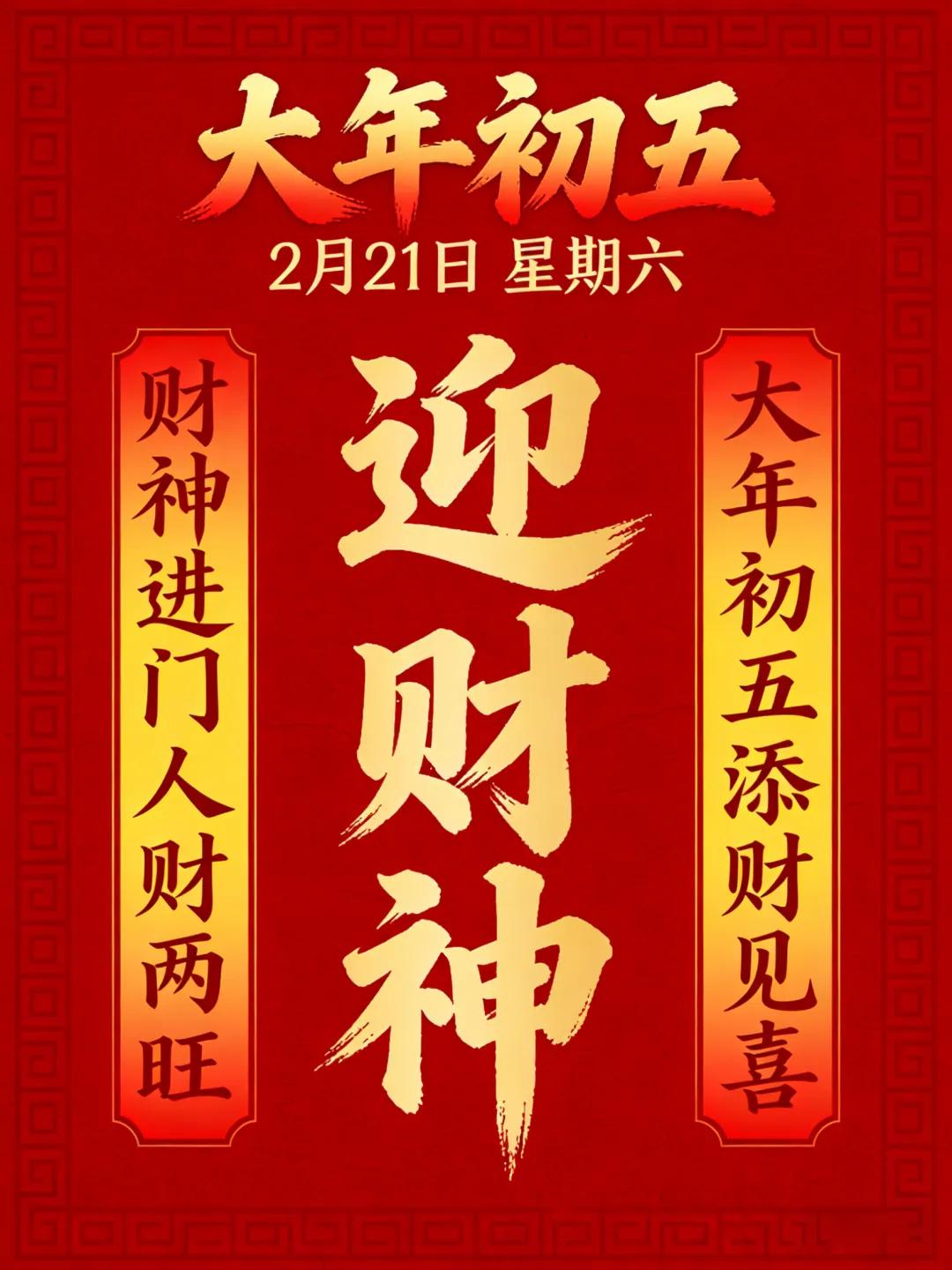 大年初五迎财神,大财小财,八方来财,正财横财,恭喜发财,财神日,接财神,财气冲天,财运亨通!