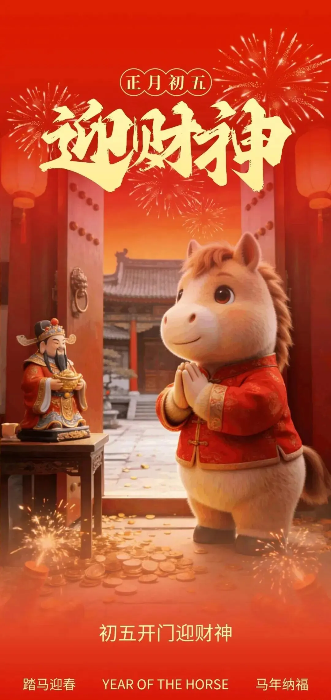 4. 迎财神,接好运!马年大年初五,祝你才华如骏马驰骋,不可阻挡;事业如天马行空,大有可为。财源滚滚随春到,喜气洋洋伴福来,升职加薪,宏图大展!