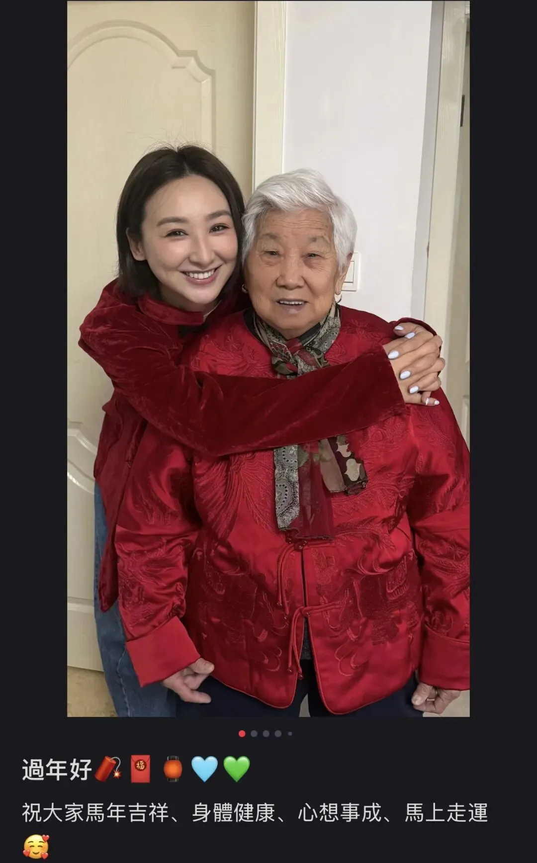 她发文送上新春祝福:“过年好,祝大家马年吉祥、身体健康、心想事成、马上走运”,简单几句,真诚又接地气。