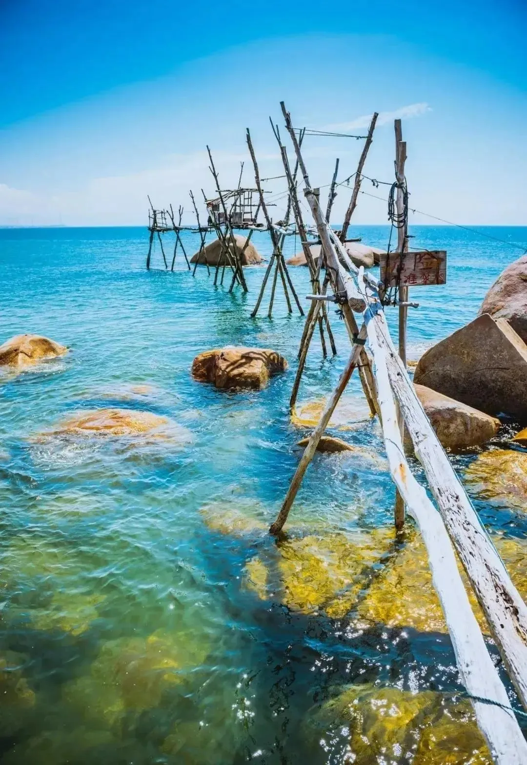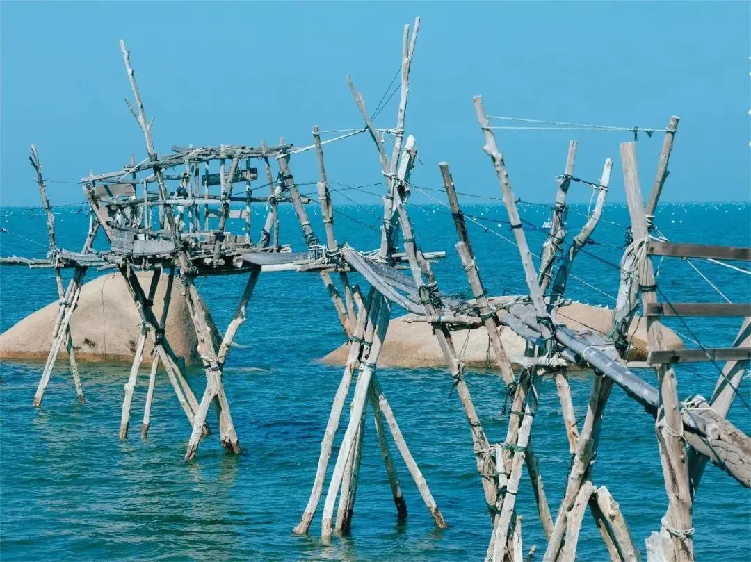 日落时,踩着微热的细沙,追着晚霞,再看立于沙滩礁石之上的古老鳗鱼架,美到让人咂舌。