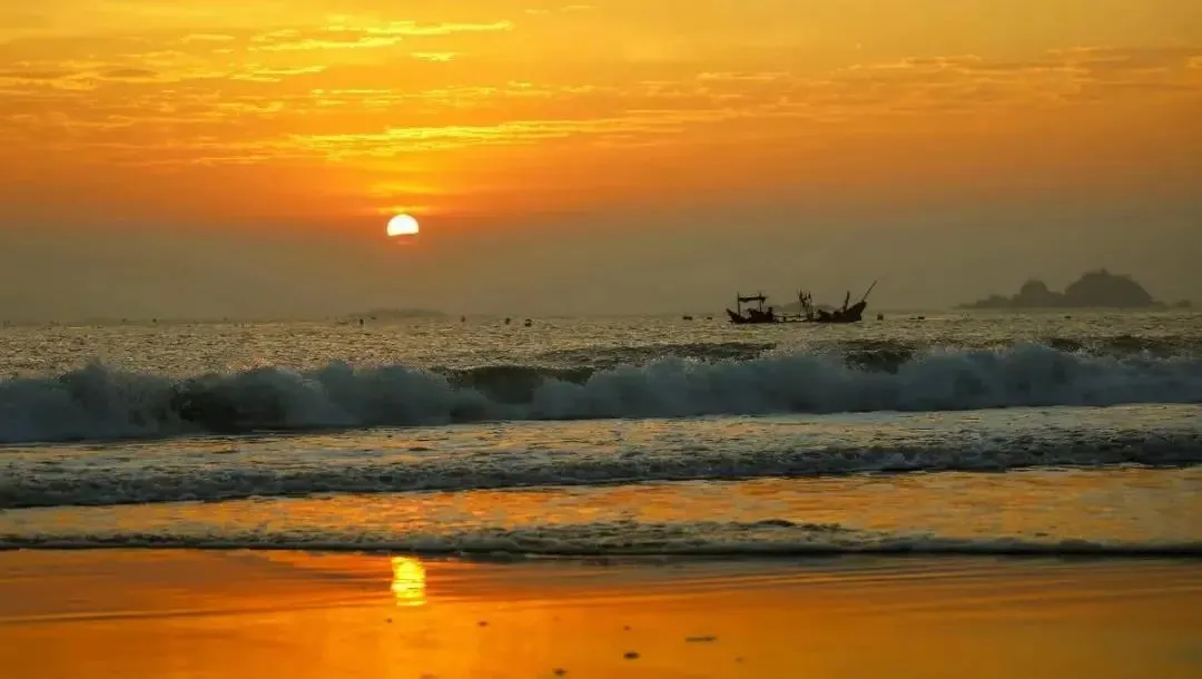 日出的晨光缕缕洒落在沙滩上,绵延六千米的银沙海岸全部晕染成了金色。