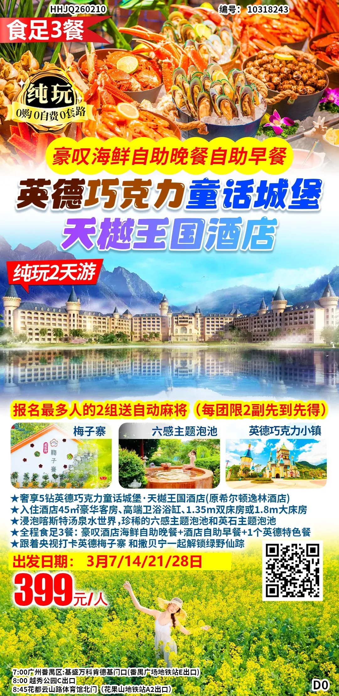 女神节奢华入住英德巧克力童话城堡天樾王国酒店、豪叹海鲜自助晚餐、泡无限次浸泡喀斯特汤泉水世界纯玩2天游399