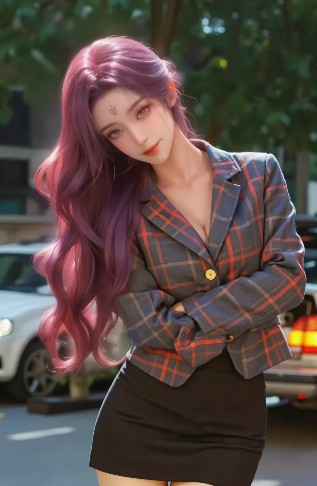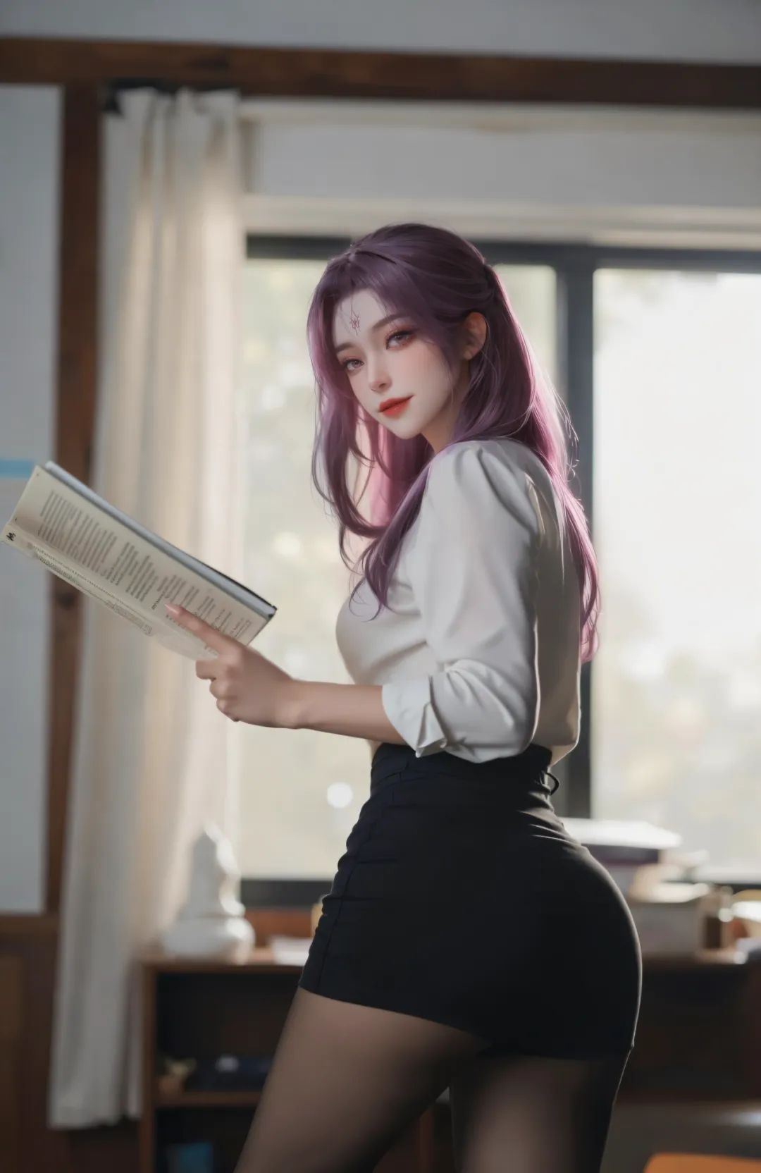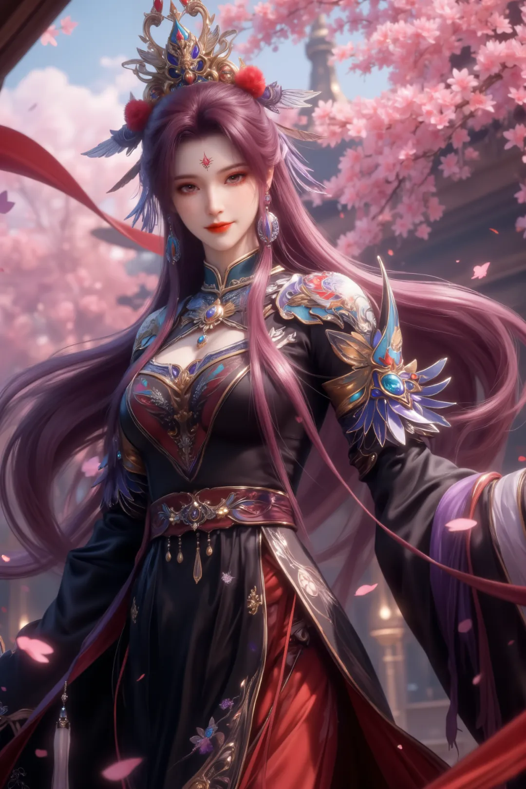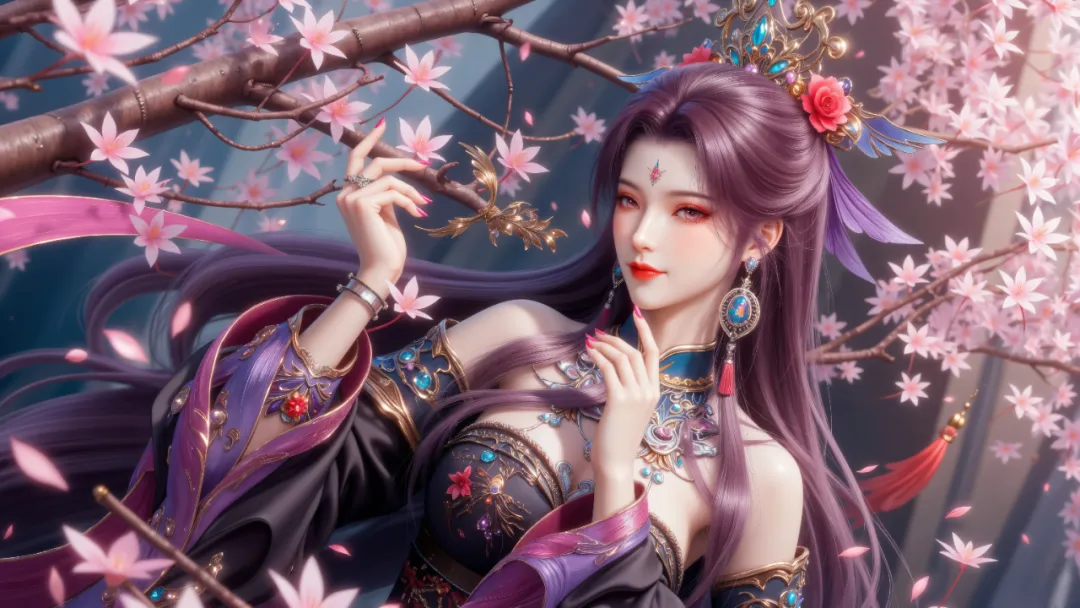 一头乌黑柔顺的长发,及腰而过,泛着莹润的光泽,发丝柔软顺滑,偶尔会夹杂几缕淡淡的紫色挑染,暗合她的魔道特质与白虎灵体。平时多由侍女打理,以一枚雕刻着莲花纹样的紫色玉簪松松挽起,余下的发丝自然垂落,发间偶尔会点缀一朵紫色的魔灵花,既是装饰,也是天圣教圣女的身份象征,魔灵花散发着淡淡的幽香,既能辅助修炼,又能彰显她的高贵与妖娆,随风飘动时,发丝轻扬,魔灵花香四溢,宛如天魔降世,艳绝天下。这个阶段的她,美得极具侵略性,冷艳高贵中藏着妩媚妖娆,却也藏着不为人知的隐忍与挣扎,她是天圣教的圣女,是众人敬仰的存在,却也是被命运掌控、无法挣脱的囚徒。