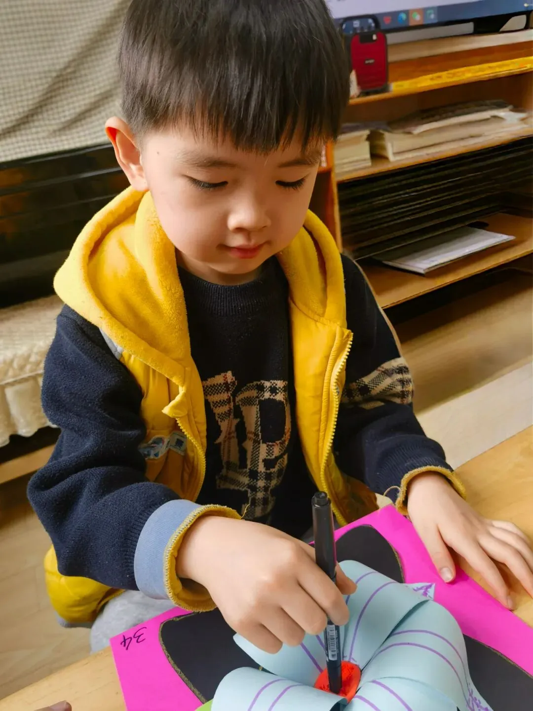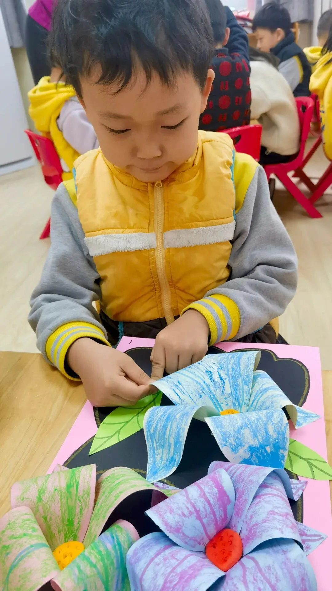 一团花簇,一份真情,五彩绚丽的花朵包含着孩子们浓浓的爱意,孩子们用灵巧的小手画一画、贴一贴、剪一剪,转眼间,一朵朵娇艳欲滴的花朵在他们手中绚烂盛放,每一朵花,都是爱的独特表达,愿这份爱,随花香飘向远方,温暖每一个家庭。