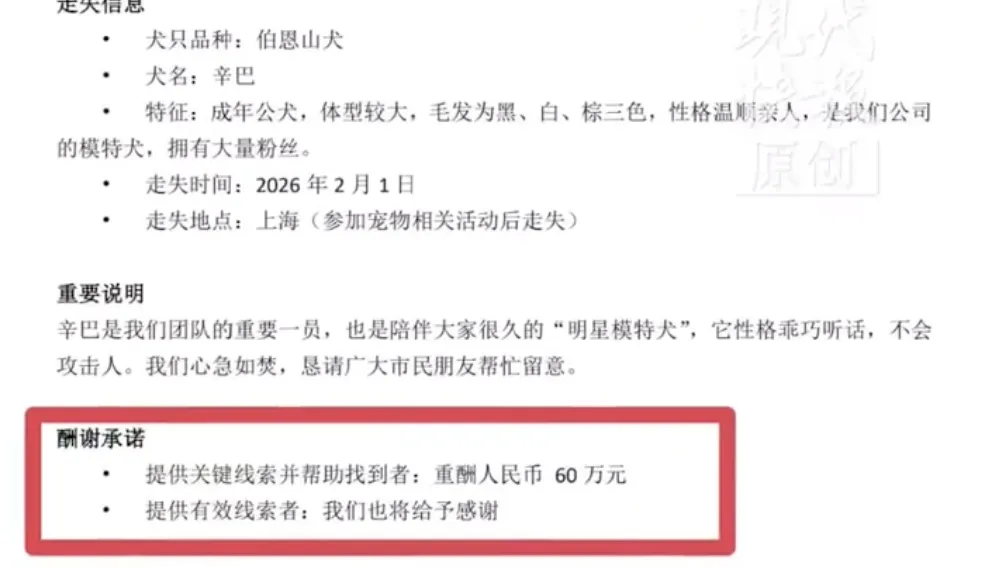 2月19日上午,现代快报记者联系到该公司相关负责人付先生。付先生称,走失的犬只名为辛巴,是一只4岁半的成年公犬,属于伯恩山犬品种,体型较大,体重约37公斤,以黑、白、棕三色为主,性格温顺亲人、乖巧听话,是公司团队的“重要一员”,更是陪伴大家多年的“明星模特犬”。“我们从小看着它长大,养了4年多,感情非常深厚。它走失后,整个团队都心急如焚,恳请广大市民朋友帮忙多留意。” 付先生说。