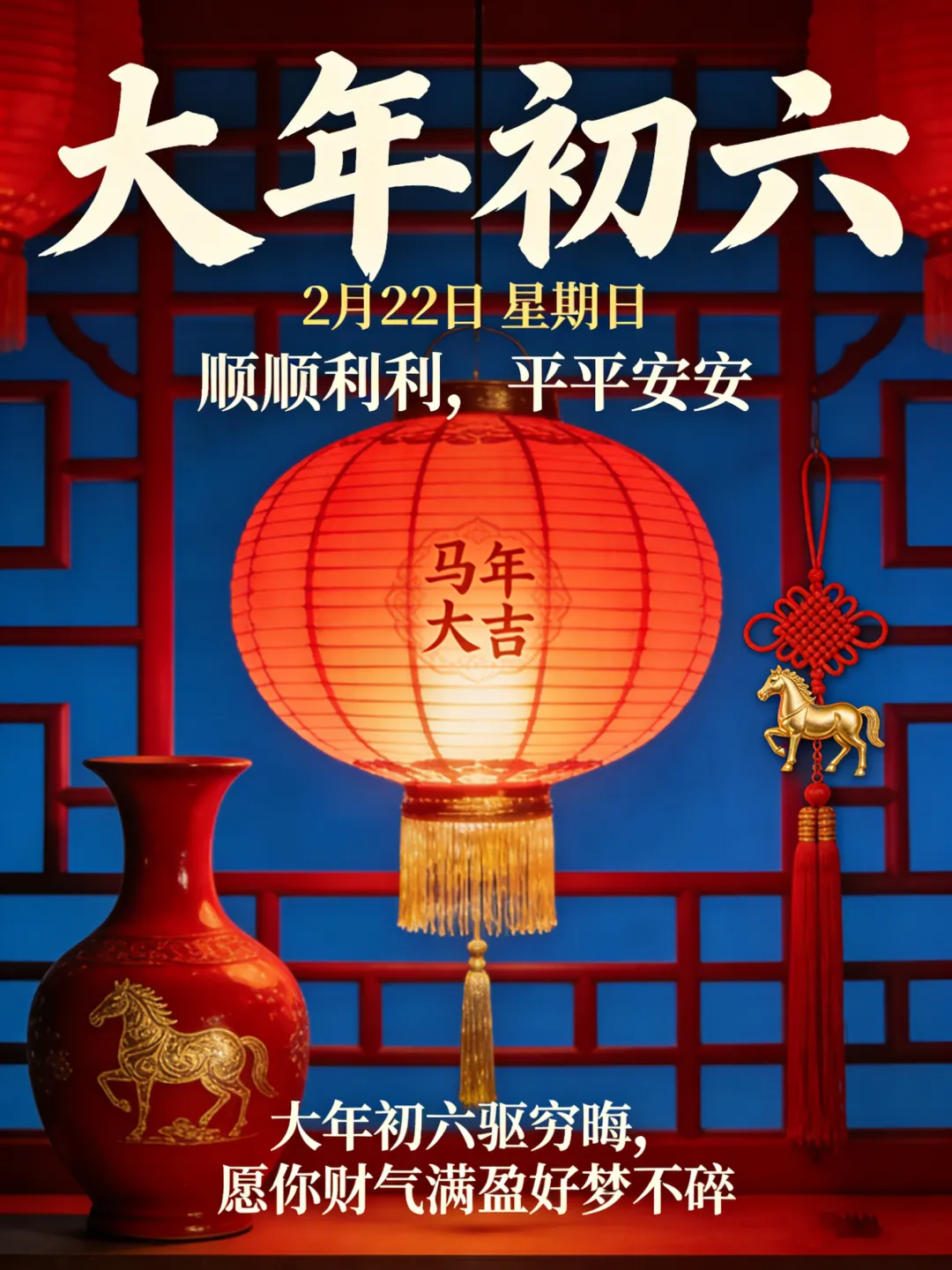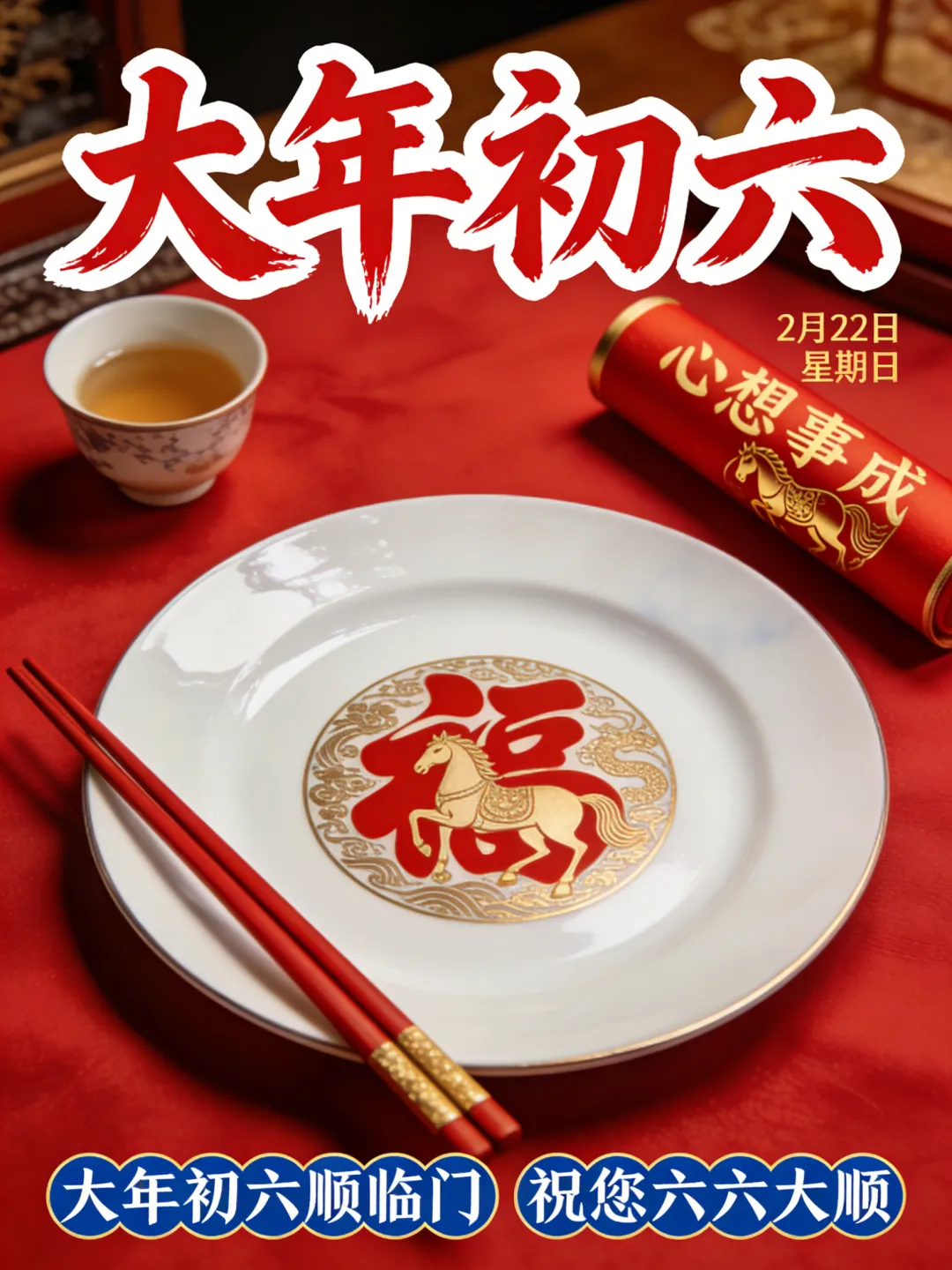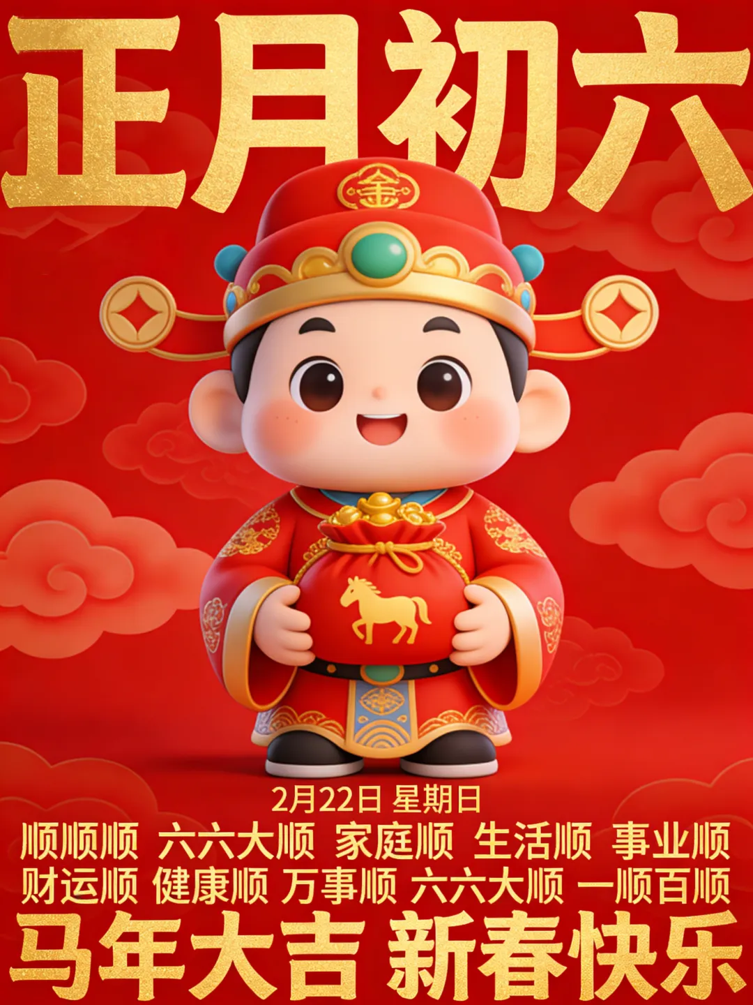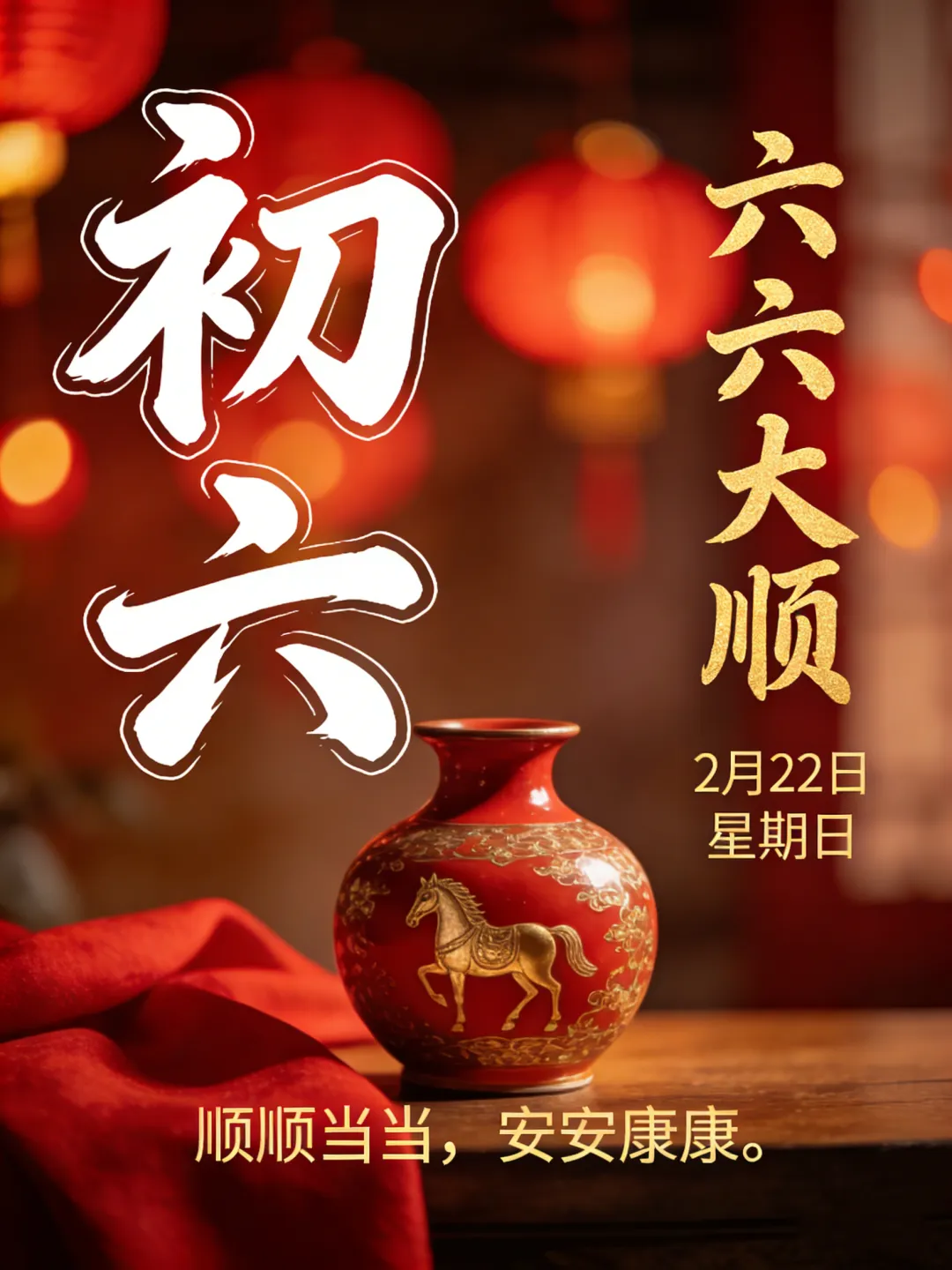 大年初六祝愿你,2026 丙午马年身体顺健健康康,事业顺蒸蒸日上,爱情顺甜甜蜜蜜,友情顺真挚长久,家庭顺和和美美,生活顺快快乐乐,一顺到底,六六大顺。