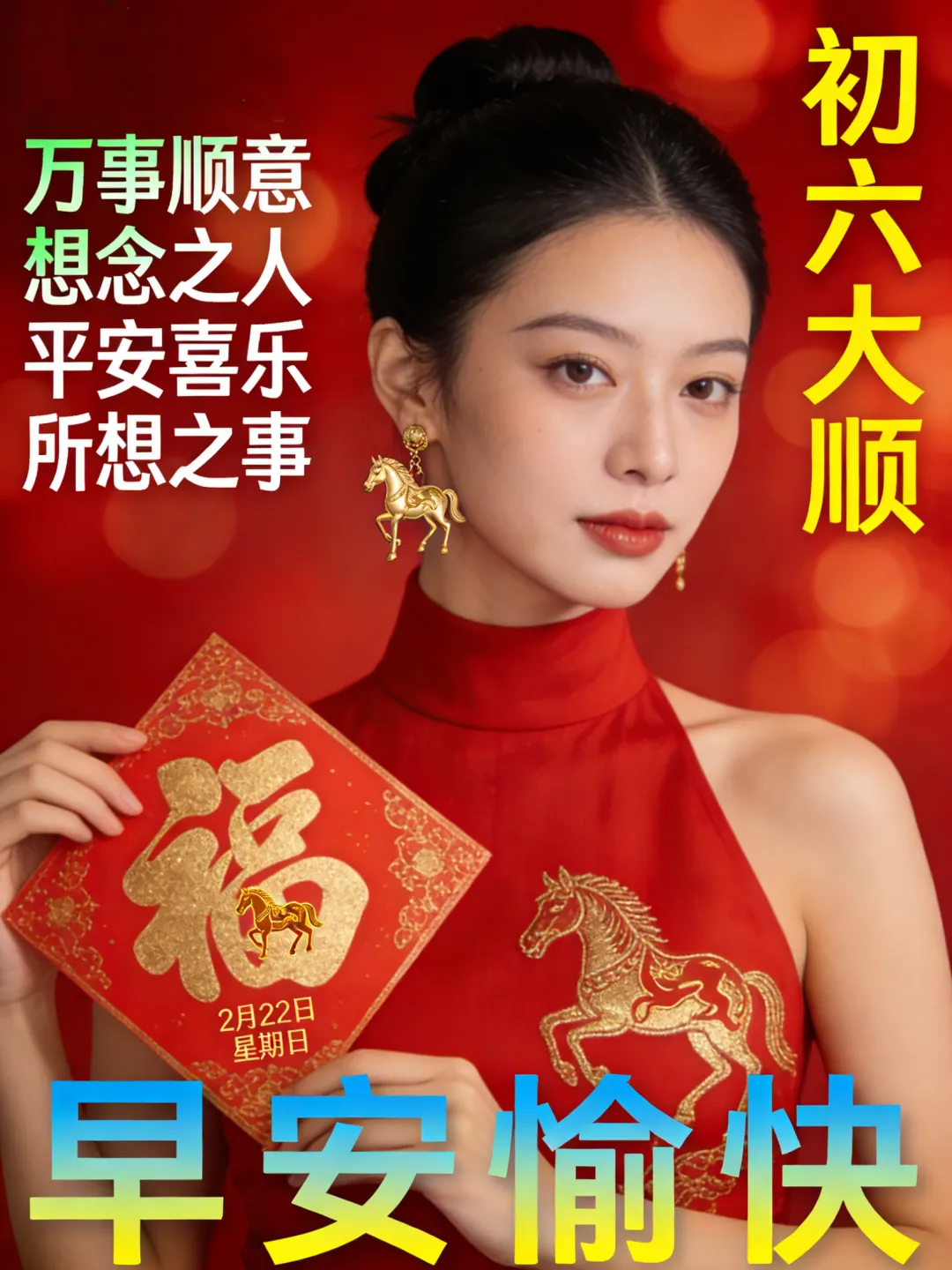 大年初六,福气绕周身。2026 丙午马年愿你春风满面笑开颜,万事如意喜洋洋。事业风生水起展宏图,财源滚滚入家门。健康平安常相伴,幸福美满乐无边,早安吉祥。