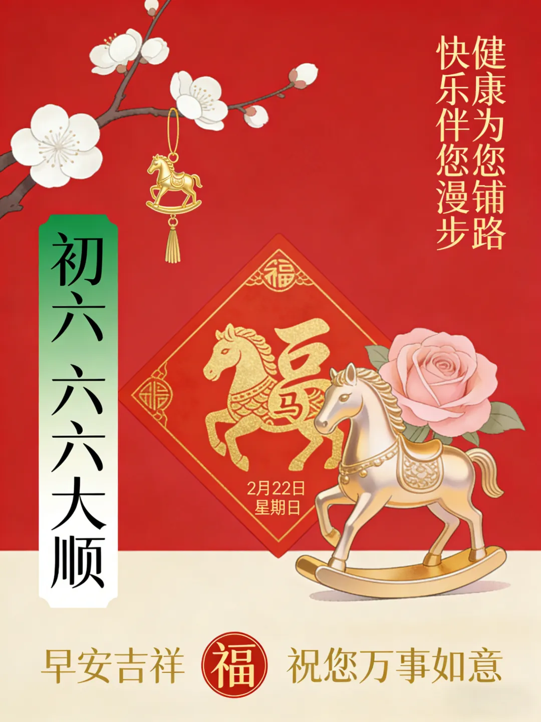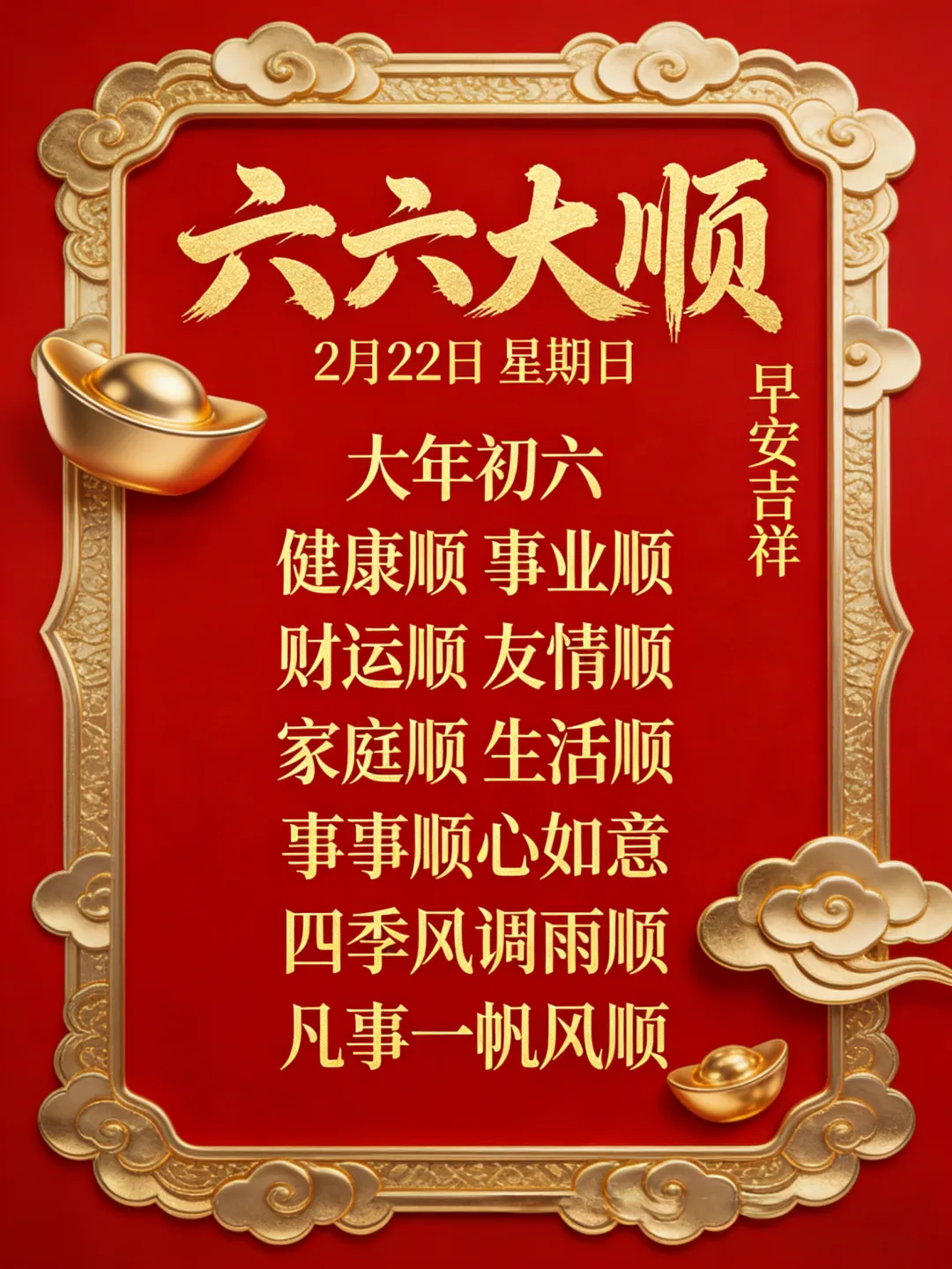 大年初六临门顺,2026 马年祝你好运六六顺。一祝工作事业步步高升,二祝幸福家庭和睦美满,三祝成绩学业突飞猛进,四祝加薪财运亨通无阻,五祝身体健康硬朗无恙,六祝和睦邻里共欢喜,早安吉祥。