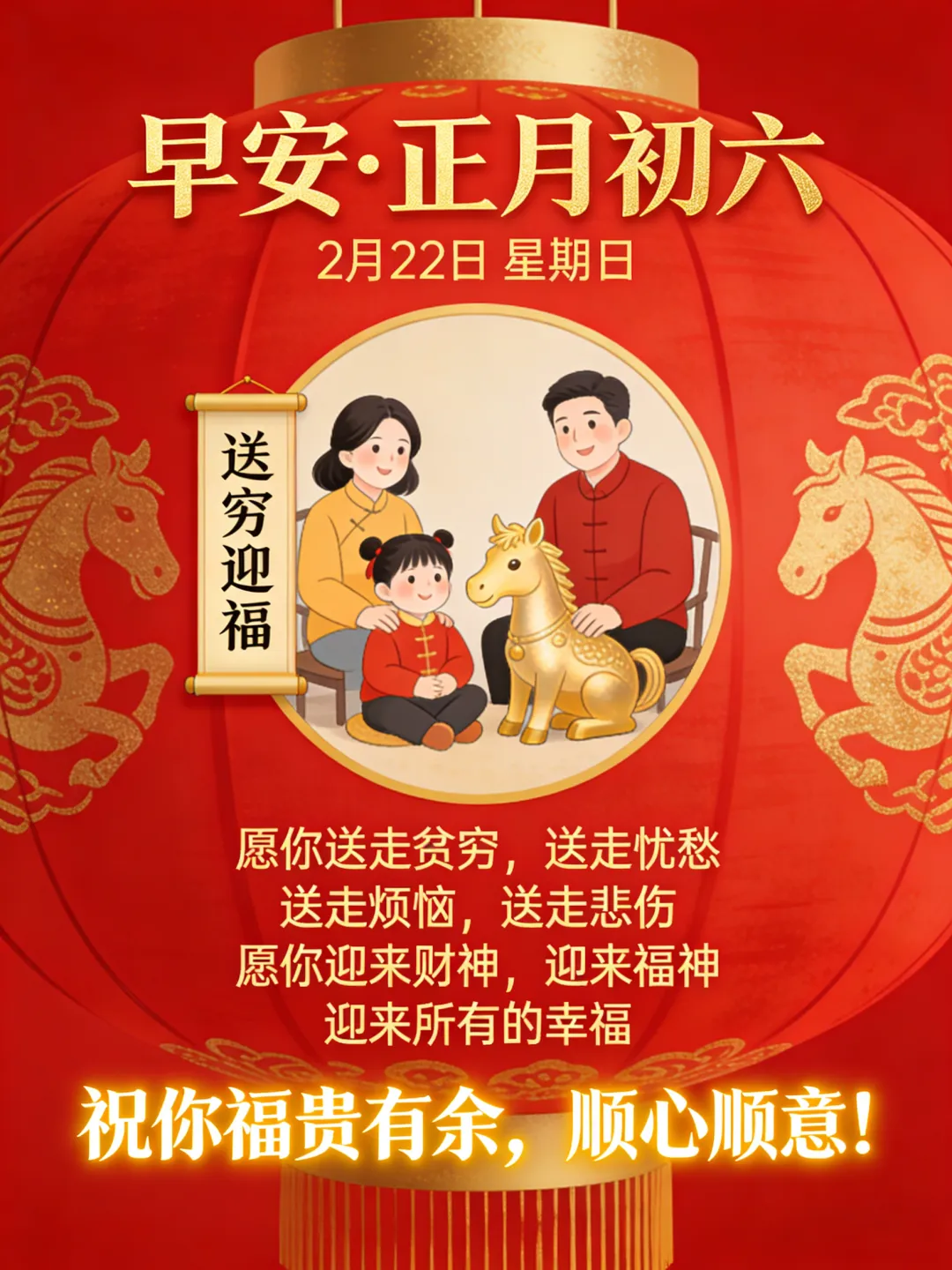 正月初六到,迎财送穷跑不掉。2026 马年财源滚滚往家跑,穷神无处来躲藏;送穷招财财运绕,金银财宝满腰包;家和美满甜蜜笑,富贵吉祥多热闹,晨安大吉,万事顺遂。