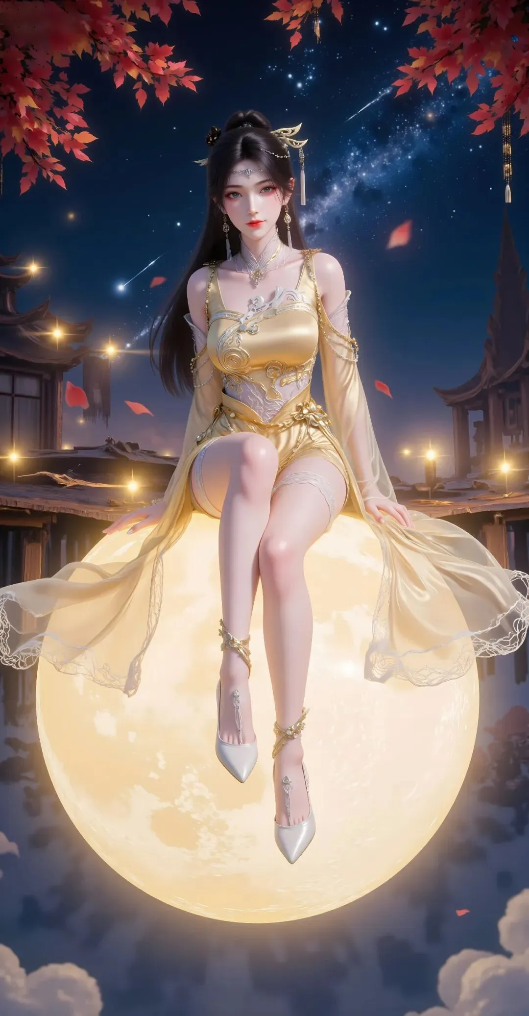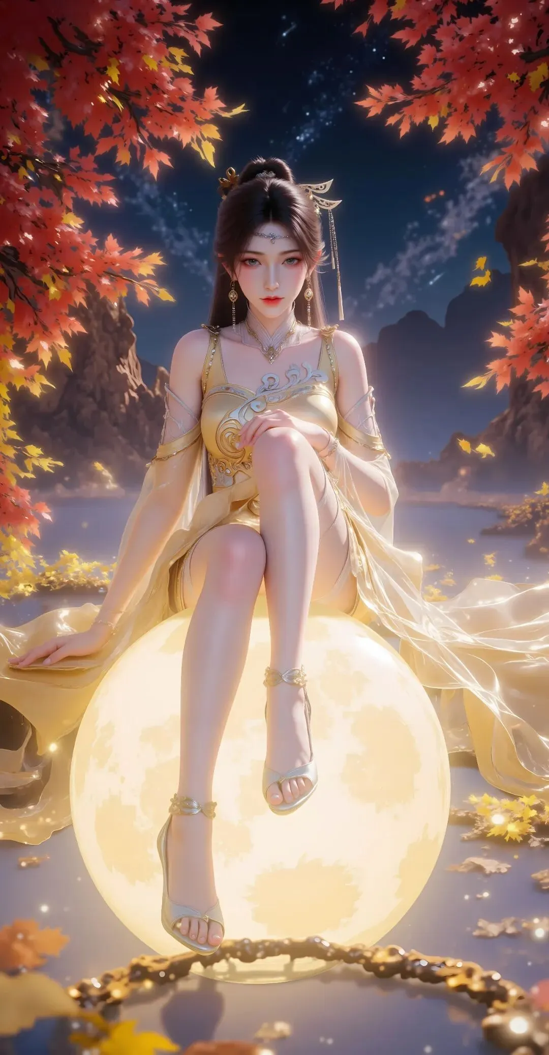 发色是乌黑柔亮的墨色,柔软蓬松,像瀑布般垂落至腰际,发丝细腻顺滑,泛着自然的光泽,平时多会用金色丝带松松束起一部分,余下的发丝自然垂落,偶尔会烫成微卷,贴在肩头,添了几分慵懒与媚态,发间偶尔会别着一朵金色的合欢花,既是合欢派核心弟子的象征,也是她媚术伪装的一部分,藏着对师门的隐忍,也藏着对生存的警惕。此时的她,容颜是她的铠甲,也是她的枷锁,每一份媚态都是刻意的伪装,每一个笑容都藏着算计,心底的伤痛与冰冷,从未有人知晓。