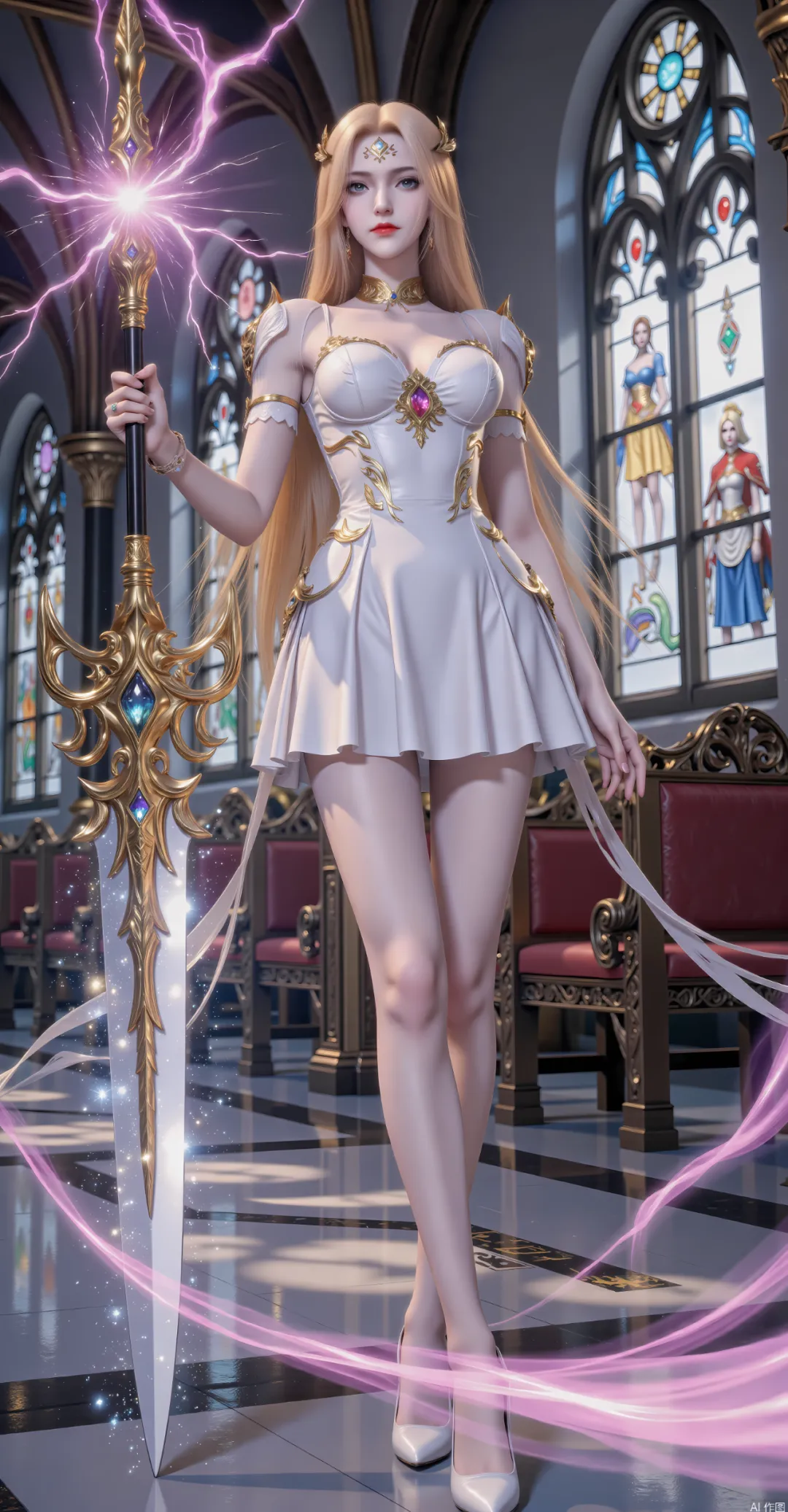 发色是璀璨的金黄色,柔软顺滑,如阳光般耀眼,长度及腰,发丝细腻有光泽,泛着淡淡的金光,平时多会用一枚黄金发冠松松束起发髻,余下的发丝自然垂落,贴在肩头与后背,添了几分柔美;发间偶尔会缠绕几缕金色的光带,那是光明神力的具象化,既能辅助她稳定神力,又能彰显她的神性,随风飘动时,与周身的金光交织,宛如天使降临。最具标志性的,便是她背后的一对金色羽翼,羽翼由无数片黄金羽毛锻造而成,每一片羽毛都晶莹剔透,泛着耀眼的金光,平时会收缩在背后,宛如一件金色的披风,展开时宽大而华丽,既能辅助飞行,又能释放光明之力,威慑强敌,羽翼挥动时,会洒落点点金光,圣洁而威严,完美诠释了“天使”之名。