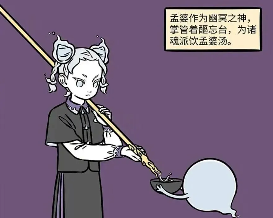 孟婆是幽冥之神,也是地府最受欢迎的角色。孟婆司掌醧忘台,平时的主要工作就是给亡魂们喝下孟婆汤。虽说随着时代发展,亡魂们投胎之前,都能定制孟婆汤,孟婆也愿意实现它们的小小心愿。可是也有亡魂喜欢找事,孟婆可不会随它们去。