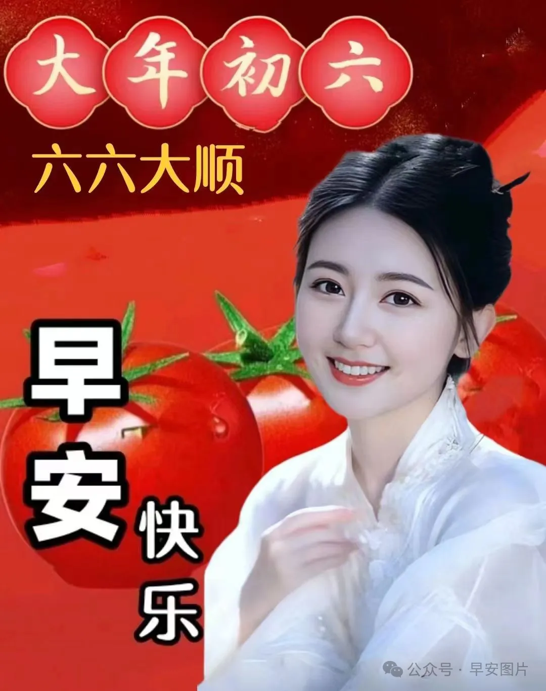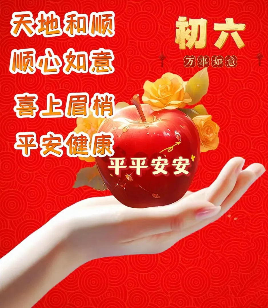 大年初六,送祝福。喜气洋洋送吉祥,一送,好运不可挡。天天赚钱幸福忙,二送,温情心中藏。朋友之间莫相忘,三送,福禄与健康。愿您身体强又壮,早安快乐!