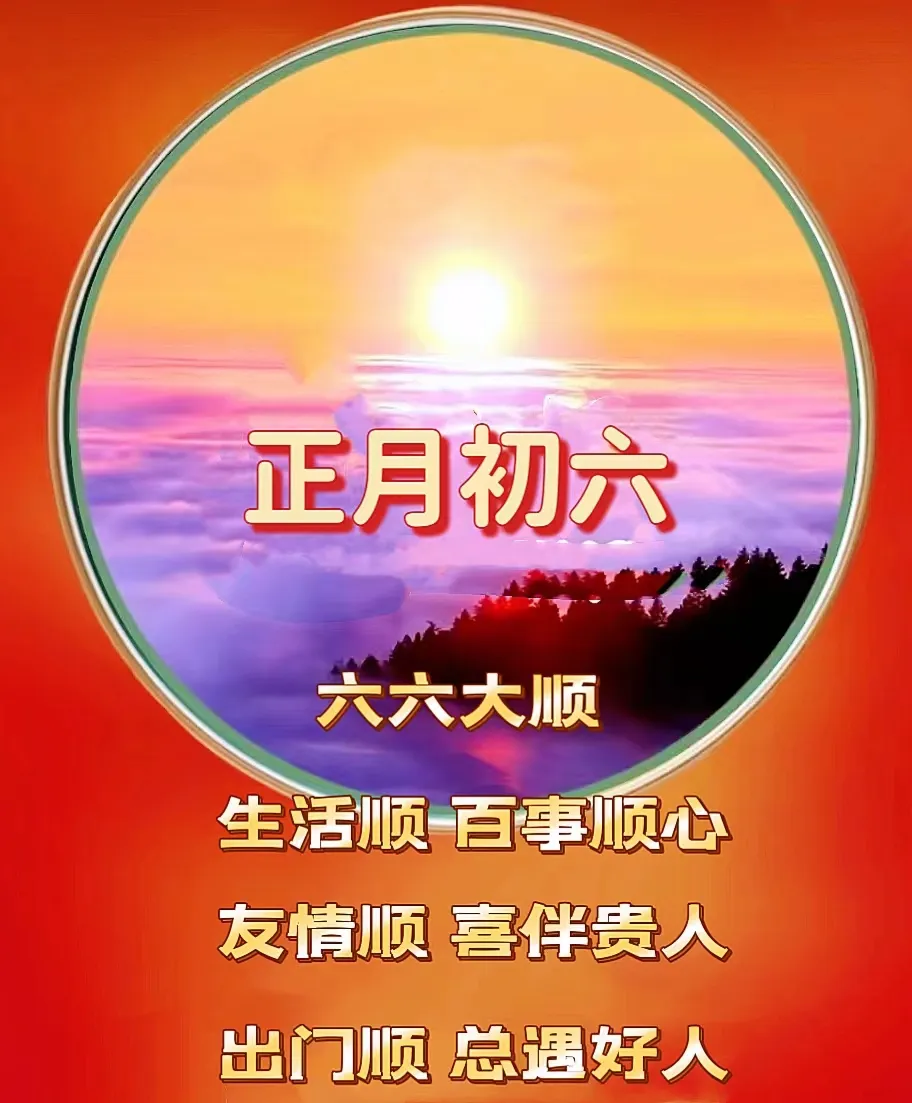正月初六,六六大顺,五湖四海,四季发财,三阳开泰,二分明月,一帆风顺,顺利之日。一顺百顺,二满三平,三星在天,四通八达,五福临门,六方兴旺!早安顺顺顺!