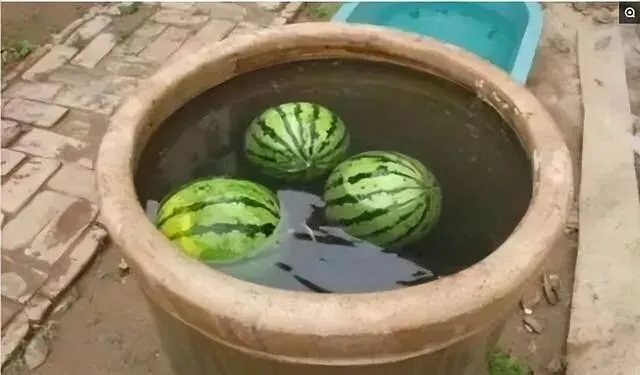 夏天最馋的事 , 就是拿个大西瓜往水盆里一泡 , 压水井的水灌满 , 等个把小时。 捞出来一刀切开 , 咬一口 , 又沙又甜 , 带着一股子井水的清气。 说真的 , 后来吃过那么多西瓜 , 冰箱冰的、冷饮店买的 , 都没那个味儿。