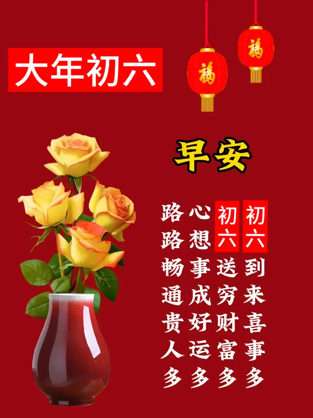 迎春送福第六天,大年初六祝福传。发财富贵笑呵呵,幸福如意真快乐。健康长寿福常在,吉祥团圆福满堂。福禄寿喜皆临门,友谊真挚齐共享。