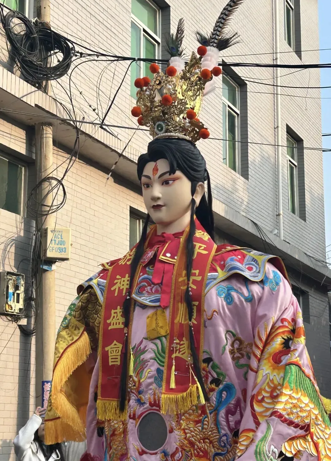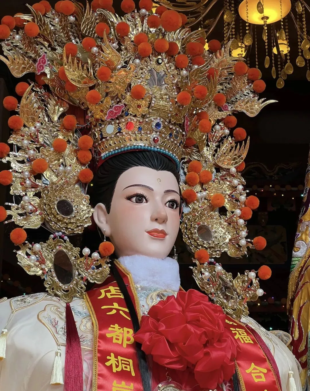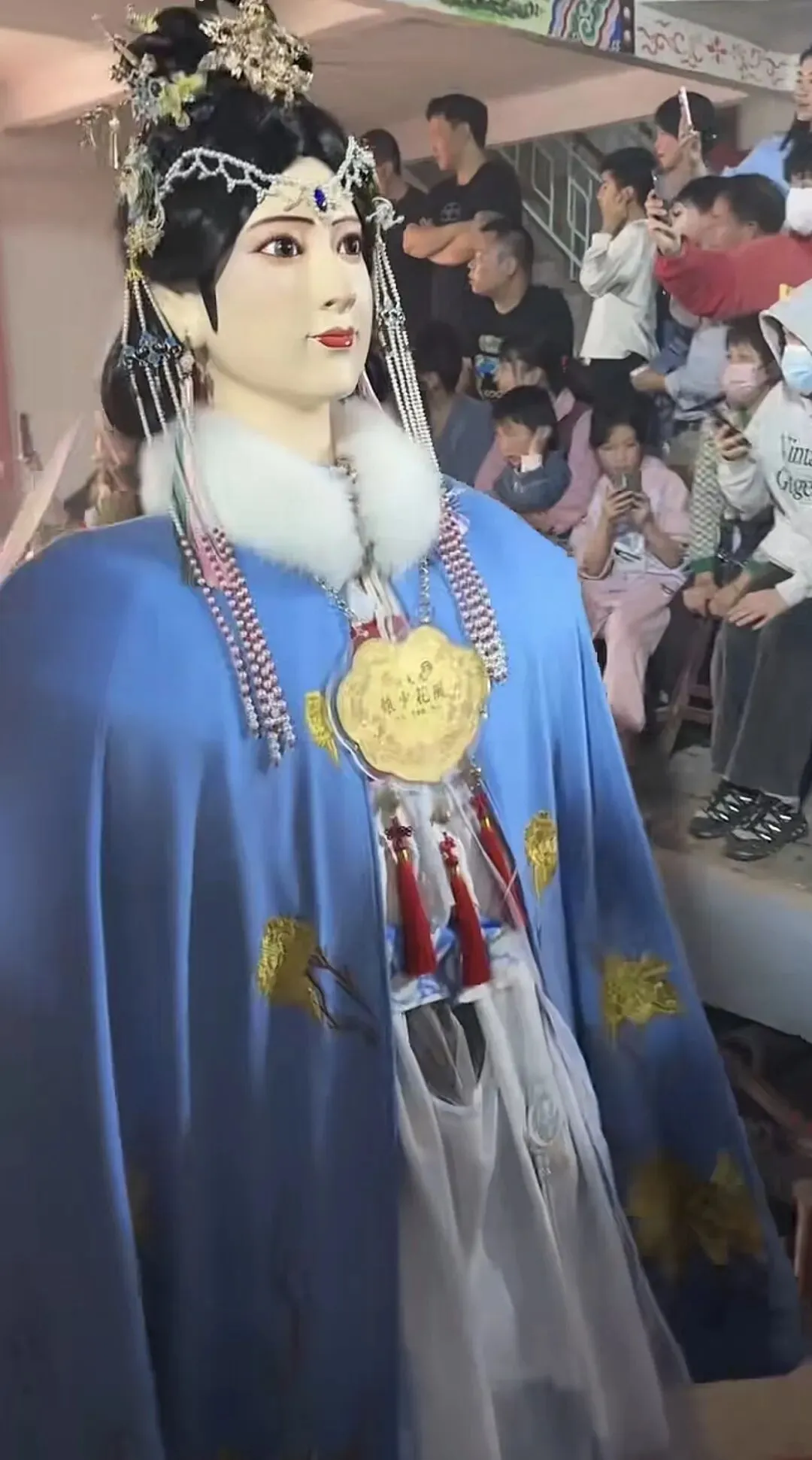 ◦ 长郡主:世子天团中的“金枝玉叶”,是五福大帝之显灵公张元伯的女儿,与张大世子、张二世子为兄妹,身份尊贵且寓意吉祥。她的神像堪称游神队伍中的“颜值巅峰”,面容温婉秀美,眉如远黛,眼含柔光,身着火凤金缕长裙,裙摆绣满缠枝莲纹样,走动时裙摆摇曳生姿;头戴开屏金凤冠,镶嵌着珠翠宝石,两侧垂着流苏,尽显华贵典雅。传说中她性情善良,掌管人间姻缘与子嗣绵延,尤其护佑女性信众。巡游时,她的銮轿装饰得更为精致,常伴有女子仪仗队随行,信众中不乏年轻姑娘与准妈妈,纷纷祈求她庇佑婚姻美满、家庭和睦、子女康健,其温婉形象成为游神中一道柔美的风景线。