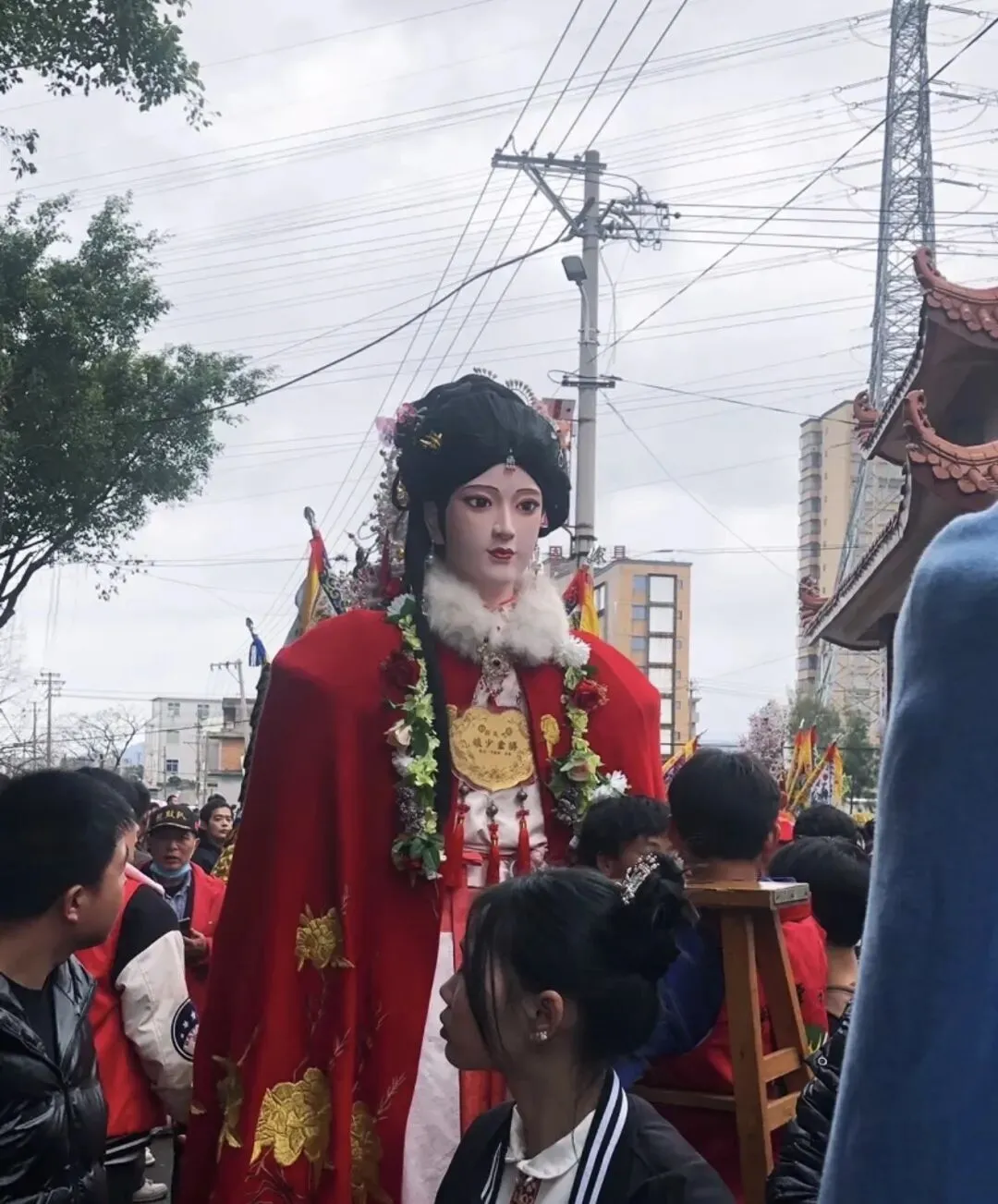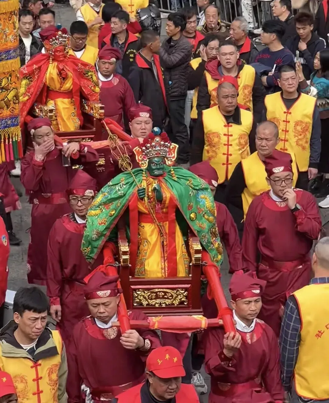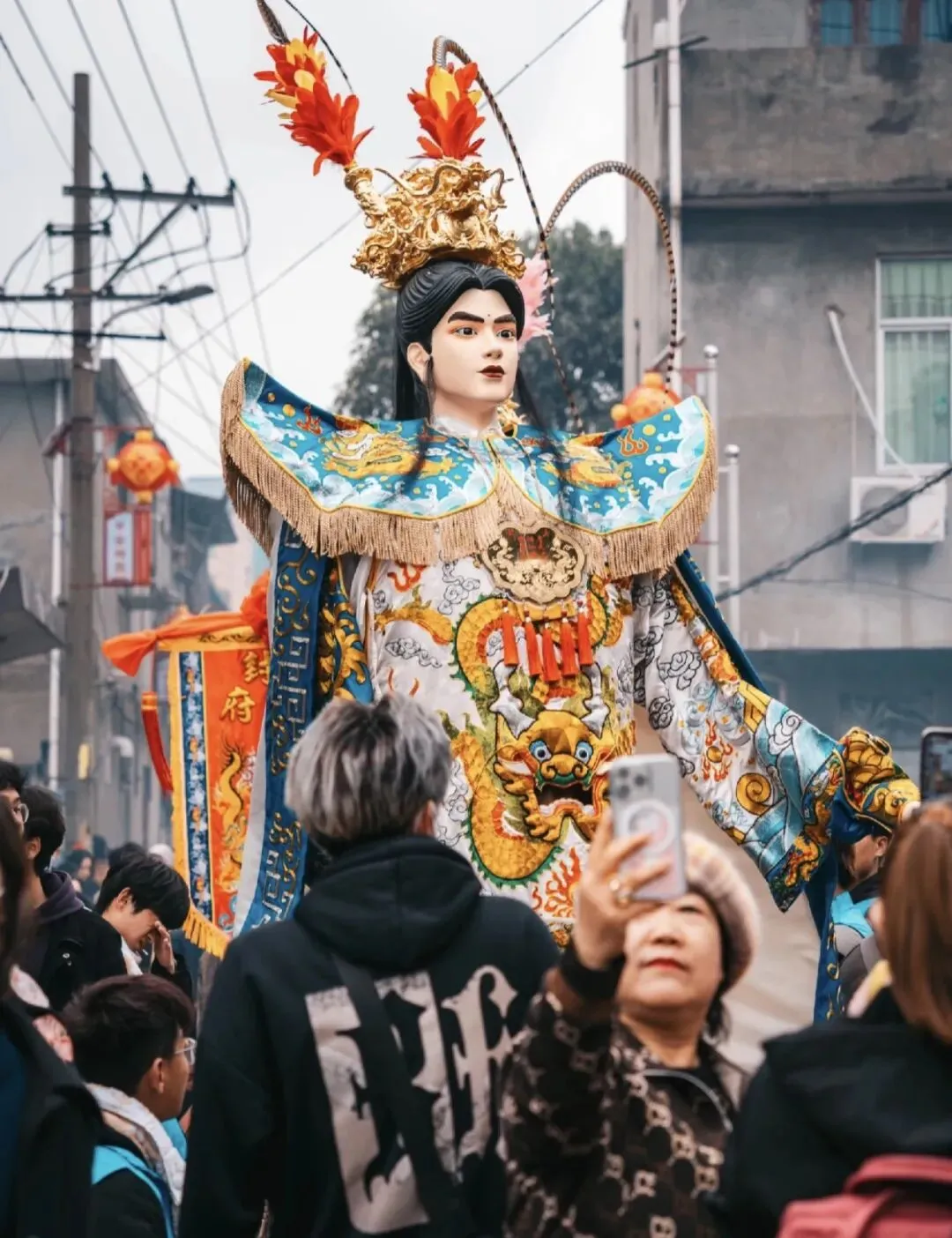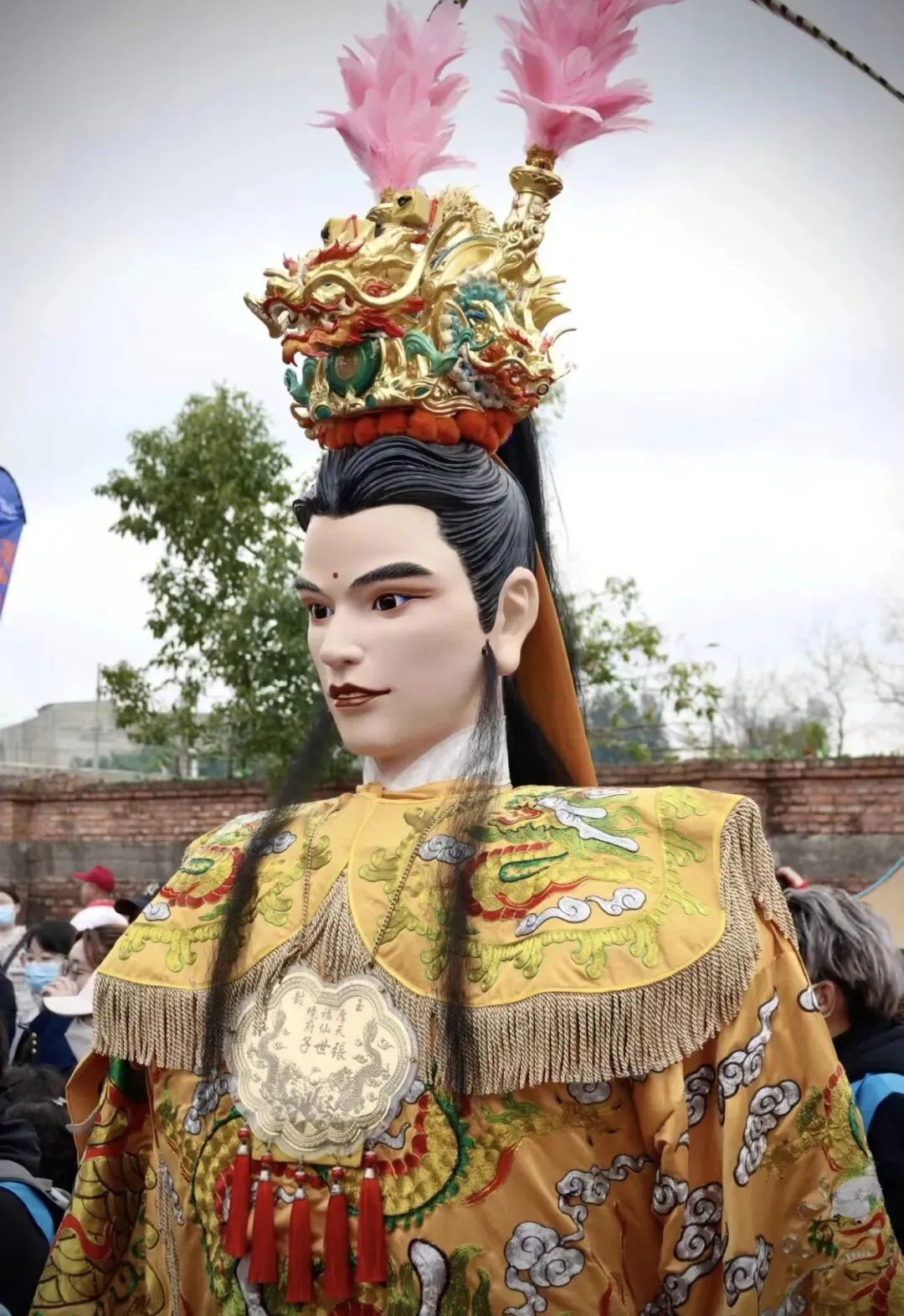 ◦ 长郡主:世子天团中的“金枝玉叶”,是五福大帝之显灵公张元伯的女儿,与张大世子、张二世子为兄妹,身份尊贵且寓意吉祥。她的神像堪称游神队伍中的“颜值巅峰”,面容温婉秀美,眉如远黛,眼含柔光,身着火凤金缕长裙,裙摆绣满缠枝莲纹样,走动时裙摆摇曳生姿;头戴开屏金凤冠,镶嵌着珠翠宝石,两侧垂着流苏,尽显华贵典雅。传说中她性情善良,掌管人间姻缘与子嗣绵延,尤其护佑女性信众。巡游时,她的銮轿装饰得更为精致,常伴有女子仪仗队随行,信众中不乏年轻姑娘与准妈妈,纷纷祈求她庇佑婚姻美满、家庭和睦、子女康健,其温婉形象成为游神中一道柔美的风景线。