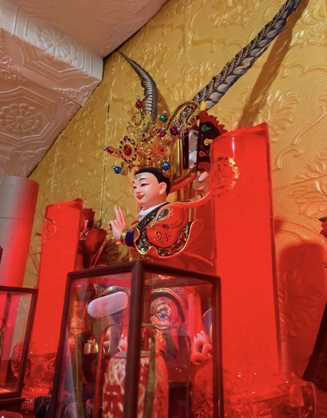◦ 金枪太子(金龙太子):来自天庭的“尊贵世子”,据说是《南游记》中玉帝的三儿子,身份显赫,象征皇权庇佑、富贵绵长。神像造型华丽贵气,身披金龙袍,手持金枪,头戴紫金冠,背后插着绘有龙纹的大旗,行进时气势恢宏。他负责护佑一方风调雨顺、国泰民安,在闽东、闽南部分地区的游神中,常作为主神的“贴身护卫”随行,其尊贵造型和神圣寓意深受信众尊崇。