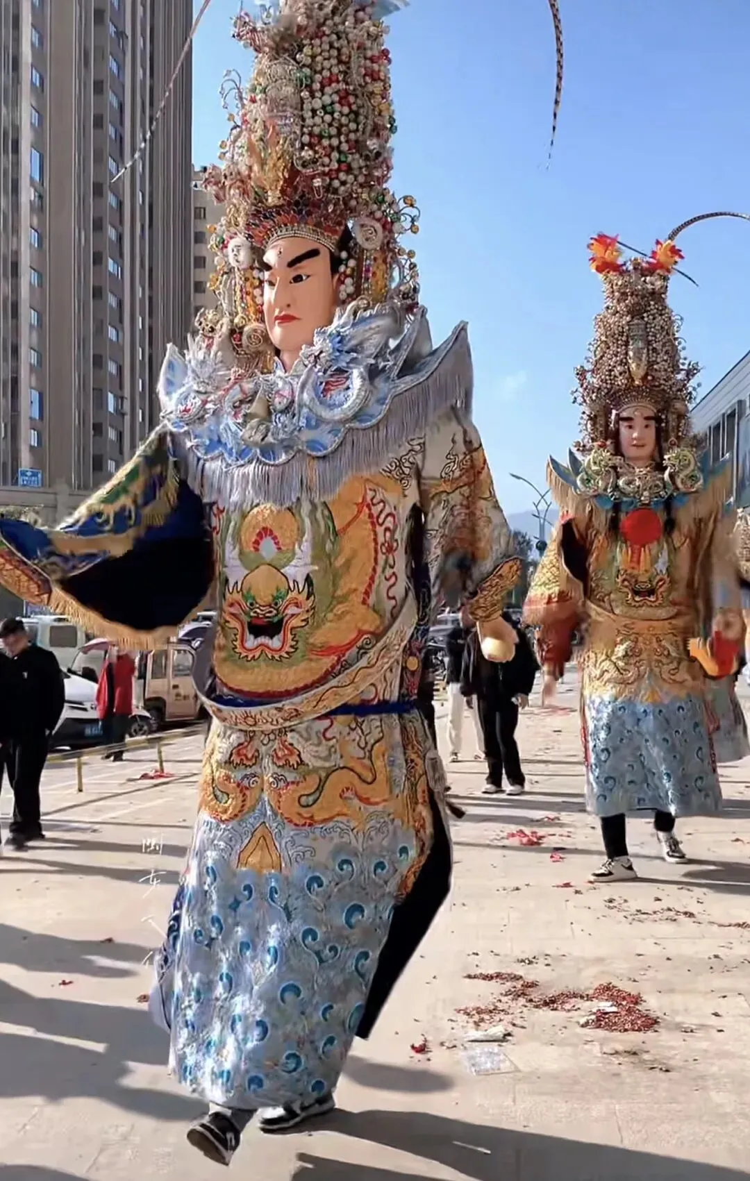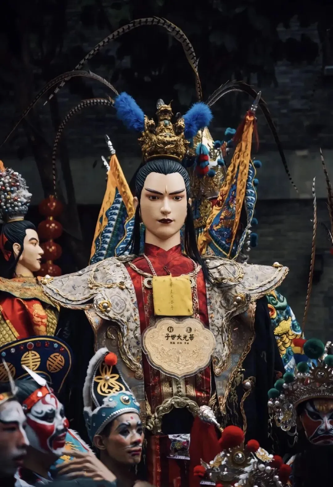 ◦ 张大世子:五福大帝之显灵公张元伯的长子,神像以“高额头”为鲜明标识,面容俊朗沉稳,身着绣有祥云瑞兽的织锦蟒袍,气质儒雅又不失威严。传说中他性格沉稳,颇有长兄风范,掌管着福运的传递,信众常向他祈求家宅和睦、事业顺遂。巡游时,他的神像多由经验丰富的壮汉扛抬,步伐稳健庄重,与弟弟张二世子的灵动形成鲜明对比,兄弟同巡的场景也成为游神中的经典画面。
