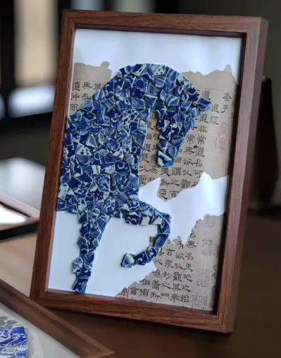 非遗青花瓷拼贴画以废弃青花瓷片为“笔”,通过匠人巧手将碎瓷重新解构、拼合,在木板或陶板上勾勒出山水、花鸟、人物等意象。瓷片天然的冰裂纹与青花钴料的晕染效果相映成趣,蓝白交织间既有水墨画的留白意境,又蕴含瓷器破碎与重生的哲学隐喻。这项技艺既是对景德镇传统制瓷智慧的二次创造,也是环保理念与东方美学的跨界对话,让千年窑火中诞生的“碎片”在当代艺术语境下焕发新生,成为承载文化记忆与手工温度的立体诗篇。