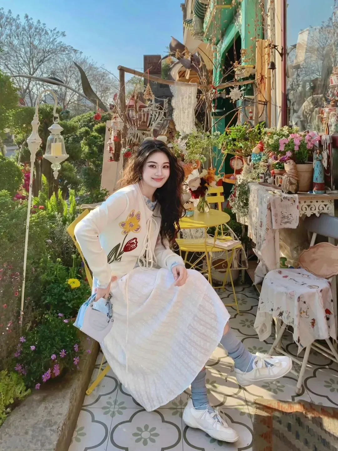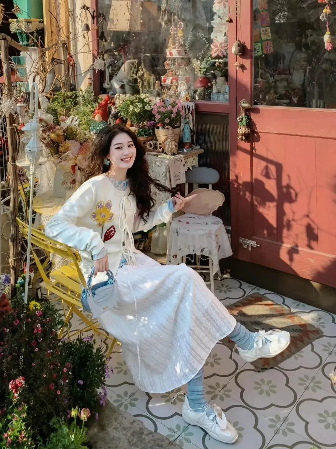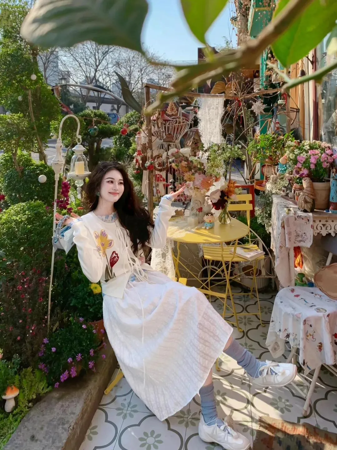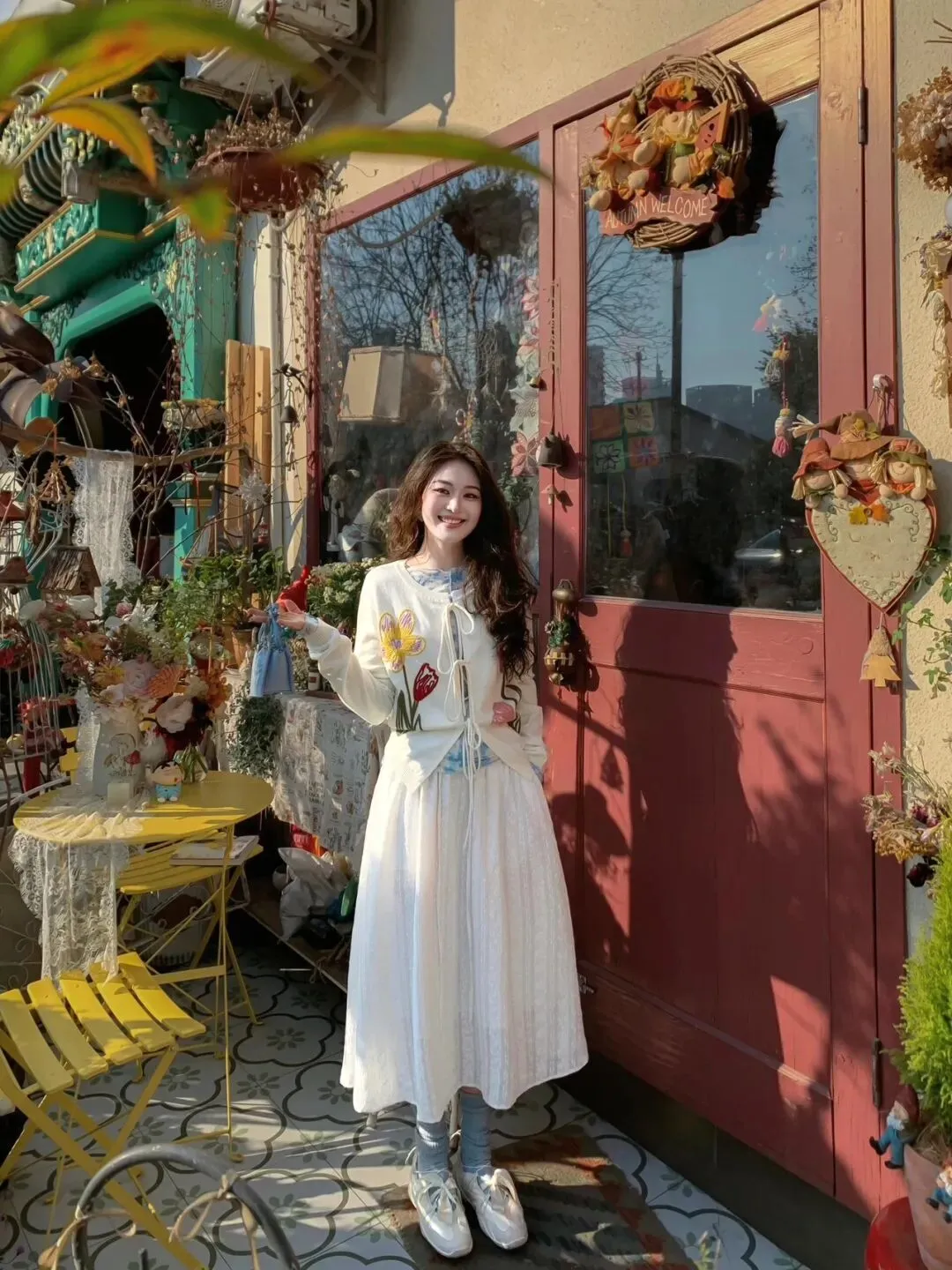 就像照片里的场景,在开满鲜花的小店门口,这套穿搭和背景完美融合。奶白色的开衫和白色半裙,在五颜六色的鲜花中显得格外干净温柔,花朵刺绣又和周围的绿植、鲜花呼应,随手一拍就是氛围感大片。