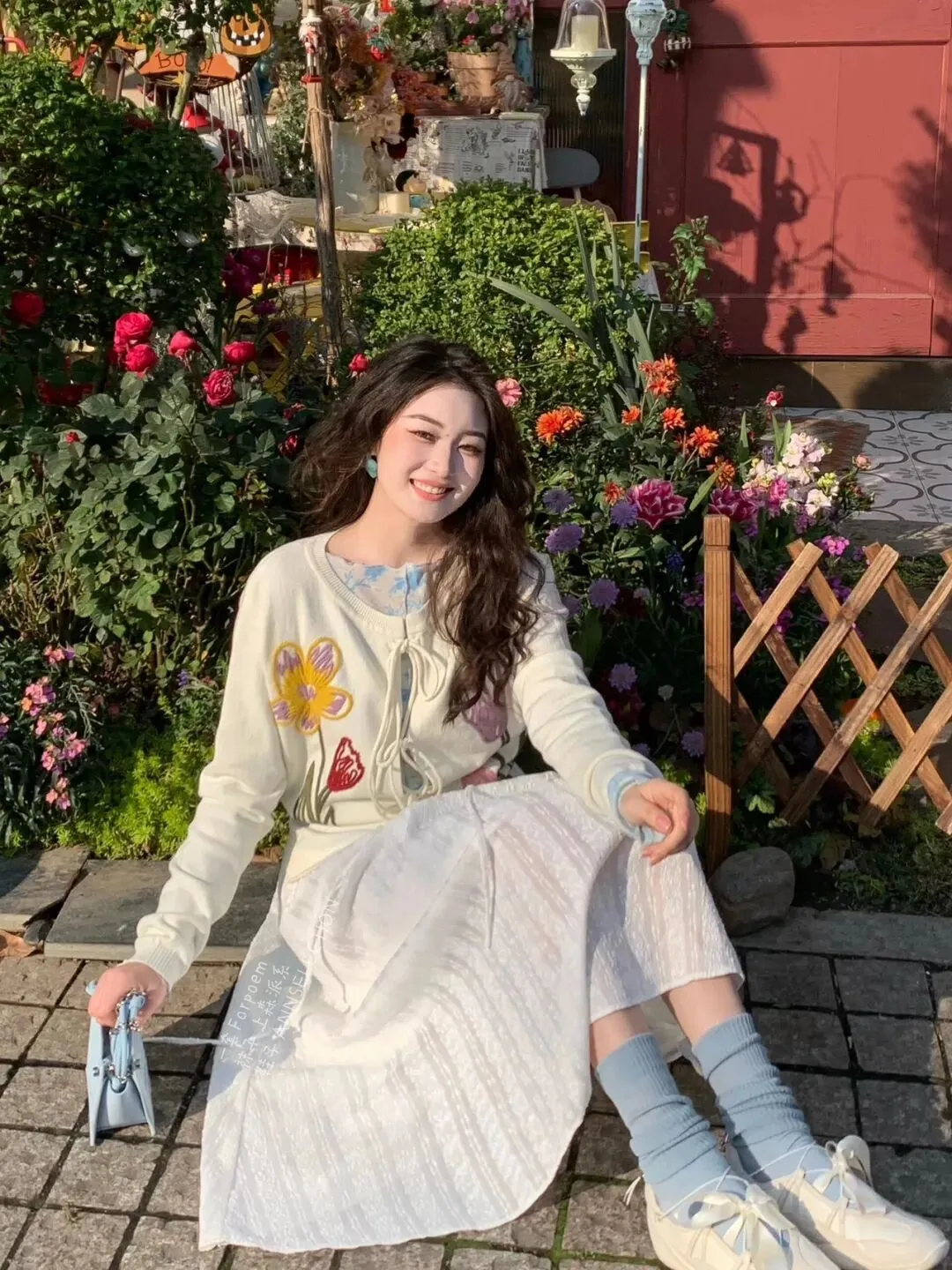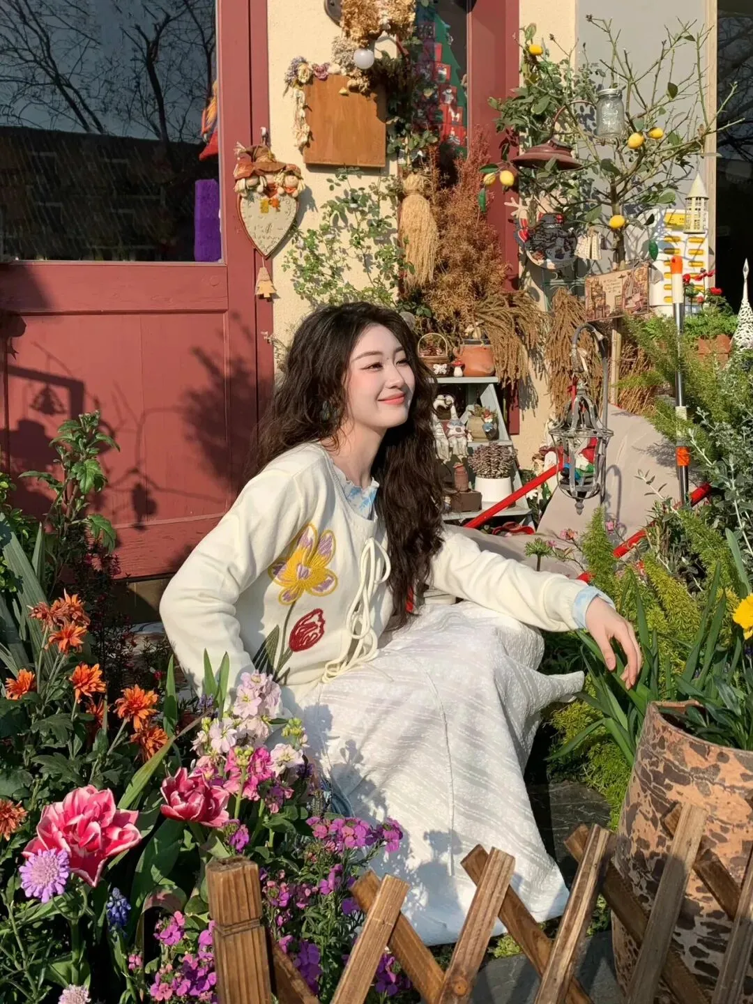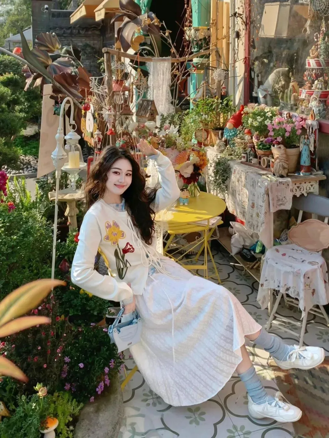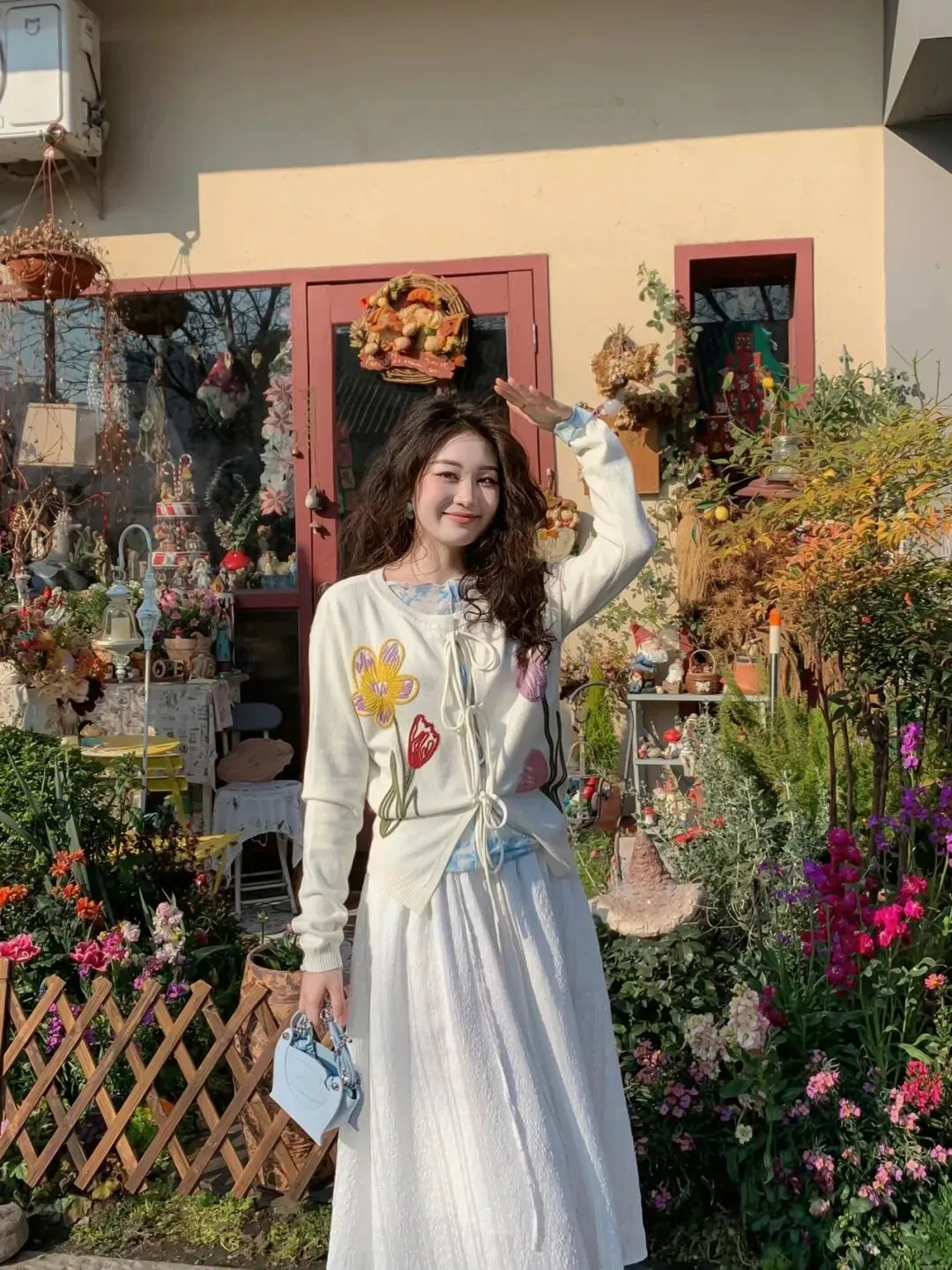 就像照片里的场景,在开满鲜花的小店门口,这套穿搭和背景完美融合。奶白色的开衫和白色半裙,在五颜六色的鲜花中显得格外干净温柔,花朵刺绣又和周围的绿植、鲜花呼应,随手一拍就是氛围感大片。