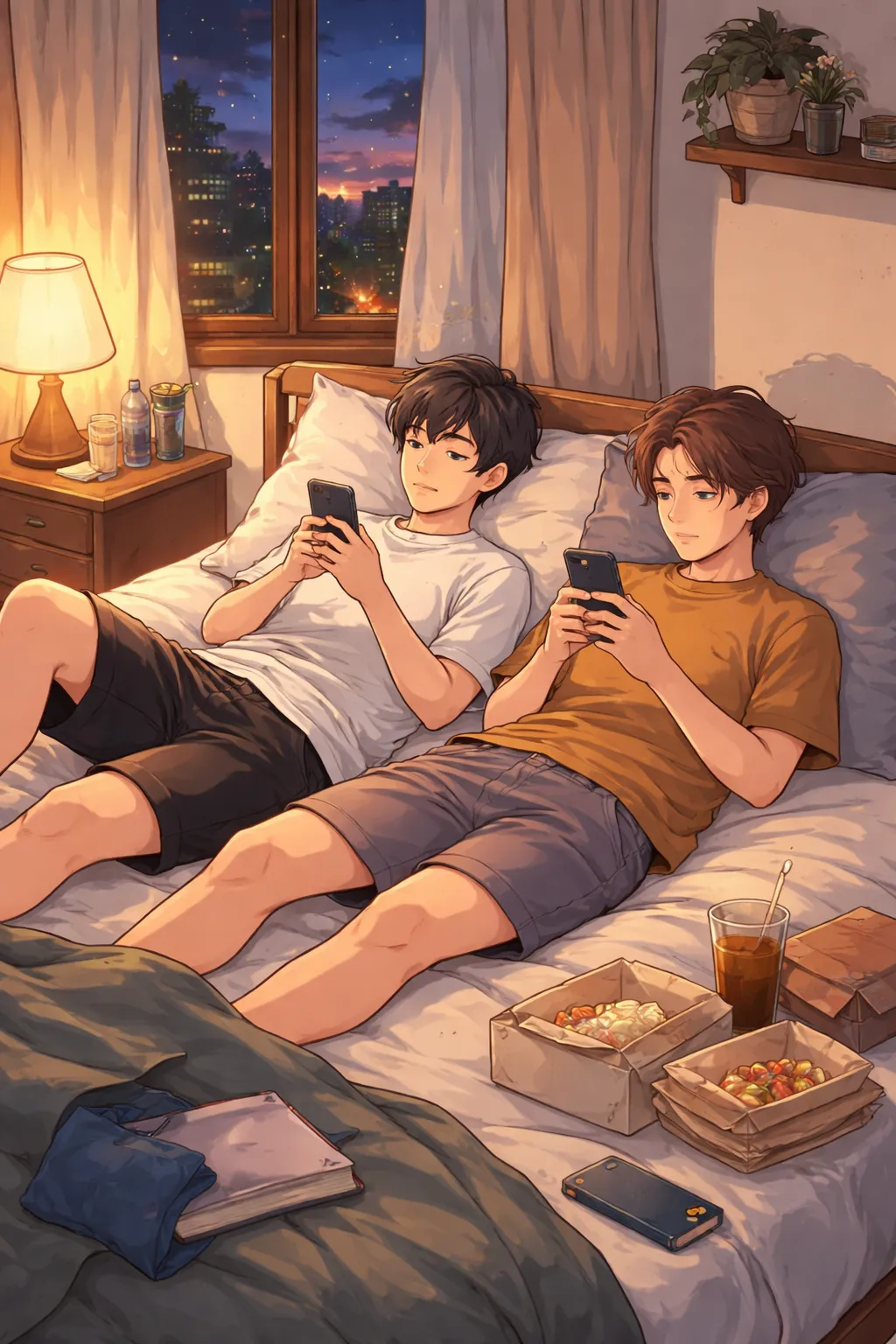 他到了之后,刚好就在第二天晚上,我的膝盖出了事。他陪我去医院,然后国庆几天我就只能在家躺着。我让他自己出去耍耍,他就不,只和我呆在家叫外卖,然后看他的小说,也不跟我怎么多聊天。我们两个就一起躺在床上,他玩手机,我玩手机。