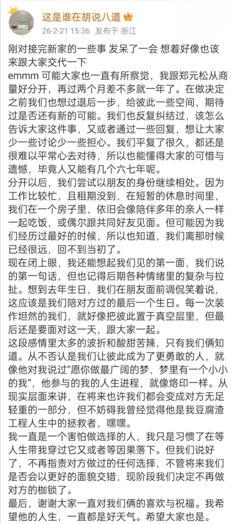 最后,两人整理好情绪,商量好公开分手的消息,以一句“彼此祝福,未来更好”体面收场。