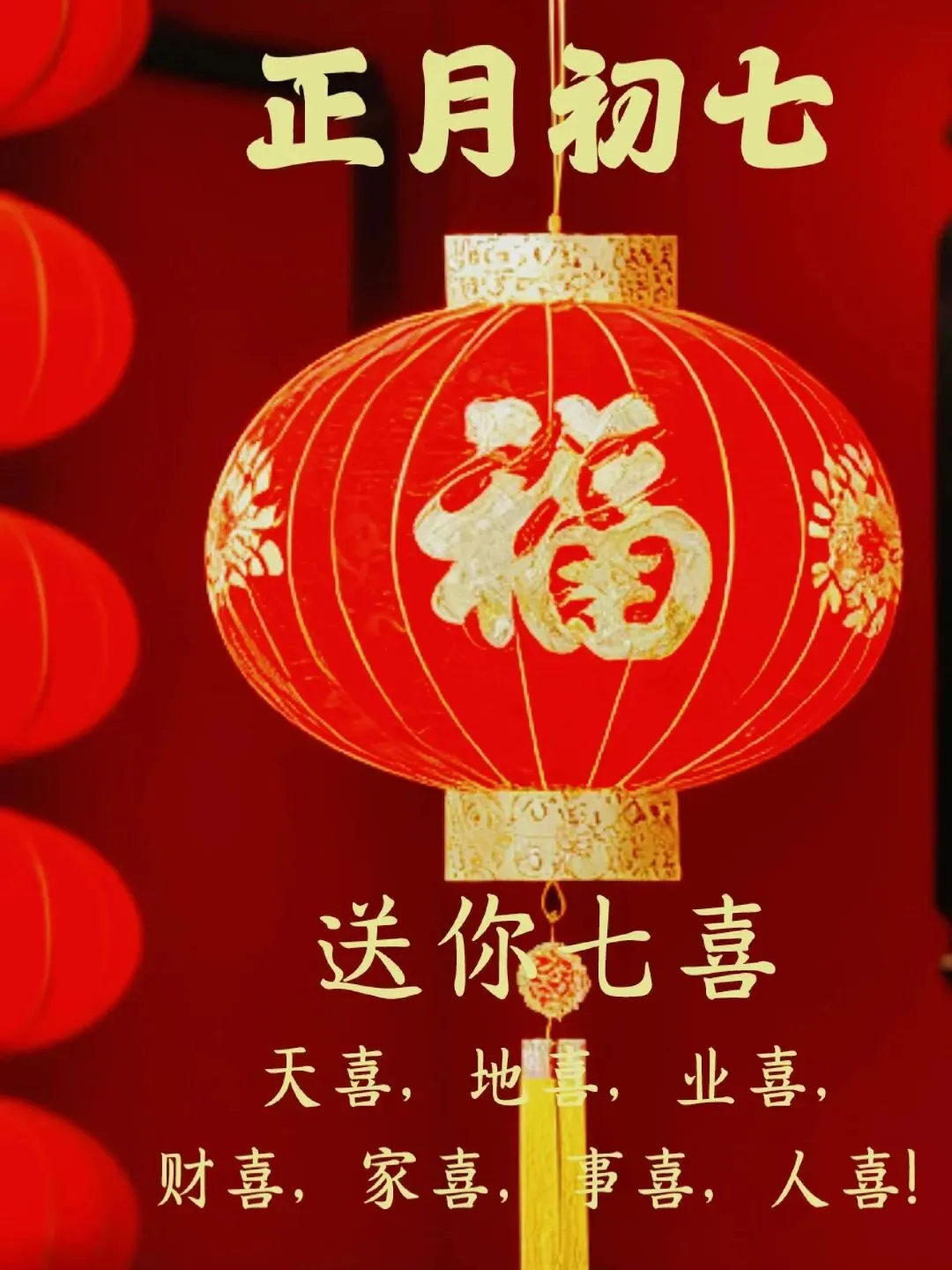 今天是农历正月初七,最美的祝福送给你,愿你生活处处有人七,万事顺利有运七,吉祥如意有福七,财源滚滚有财七,总之一切都顺七!正月初七,祝你快乐!