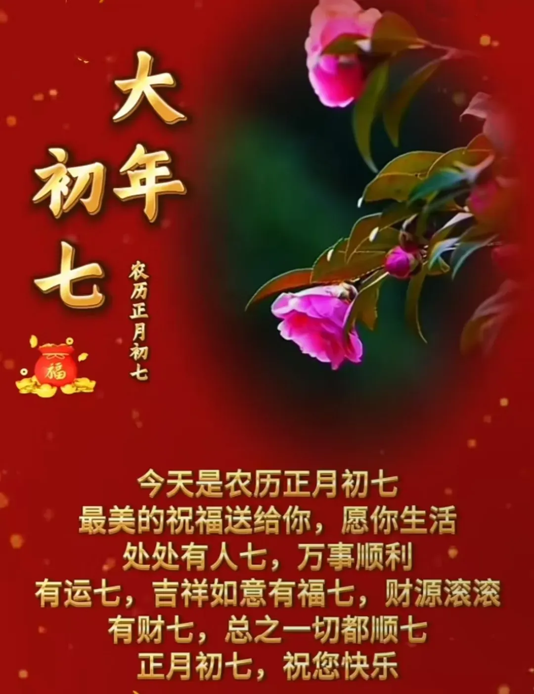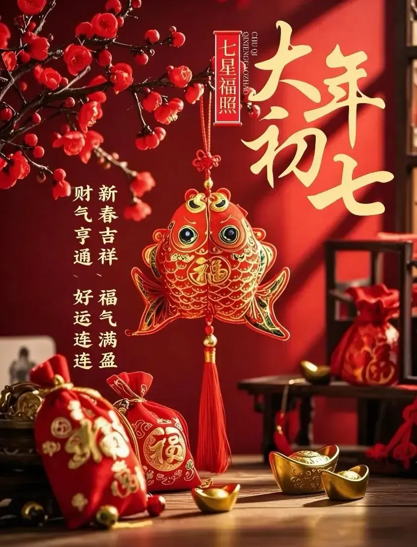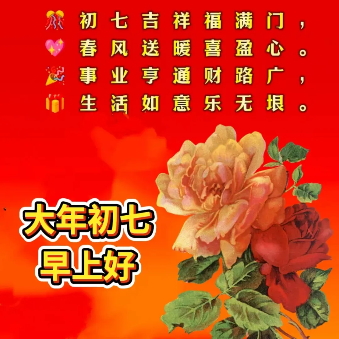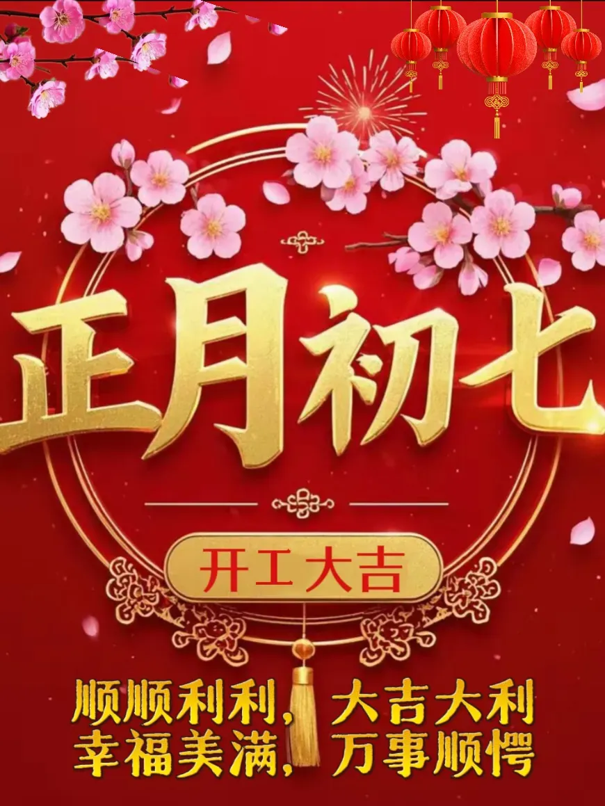 初七喜事多,红红火火乐不休。好运连连福满门,桃花盛开喜相随。幸福如意人心乐,事业顺利一帆风。大年初七美好至,快乐幸福更上层。