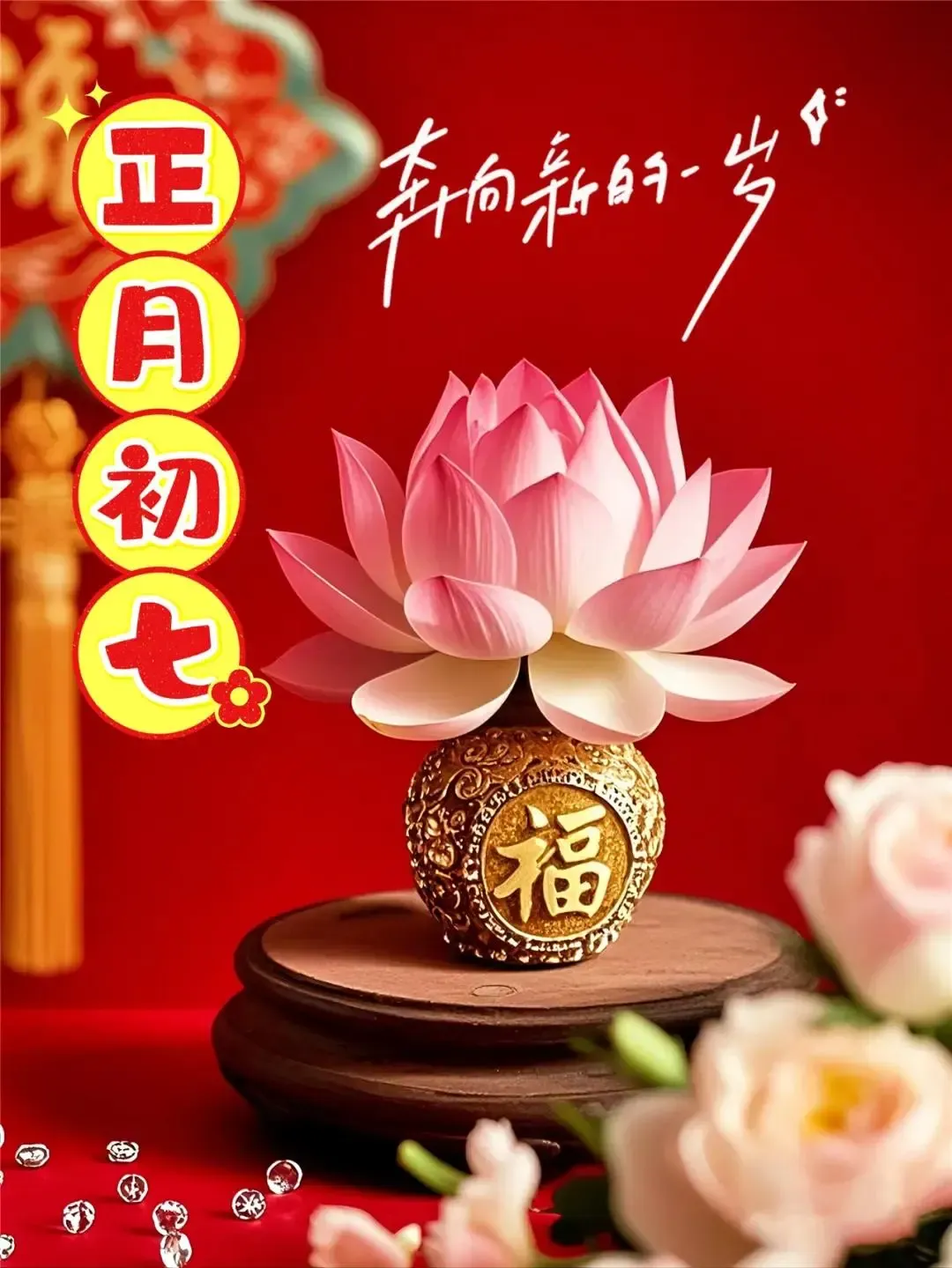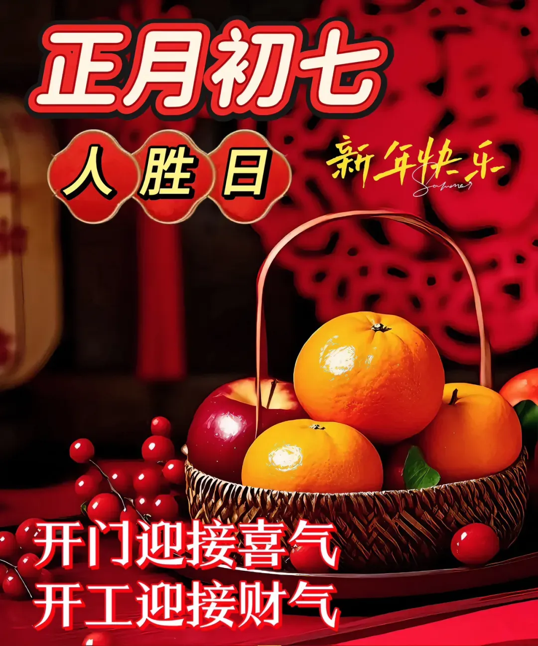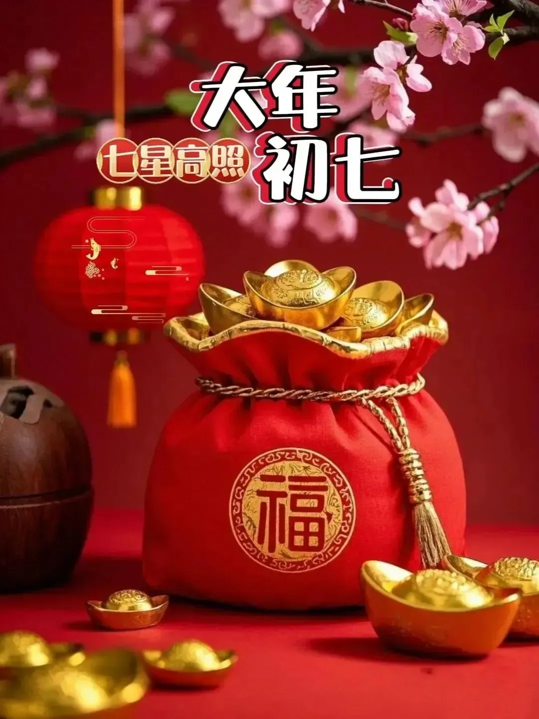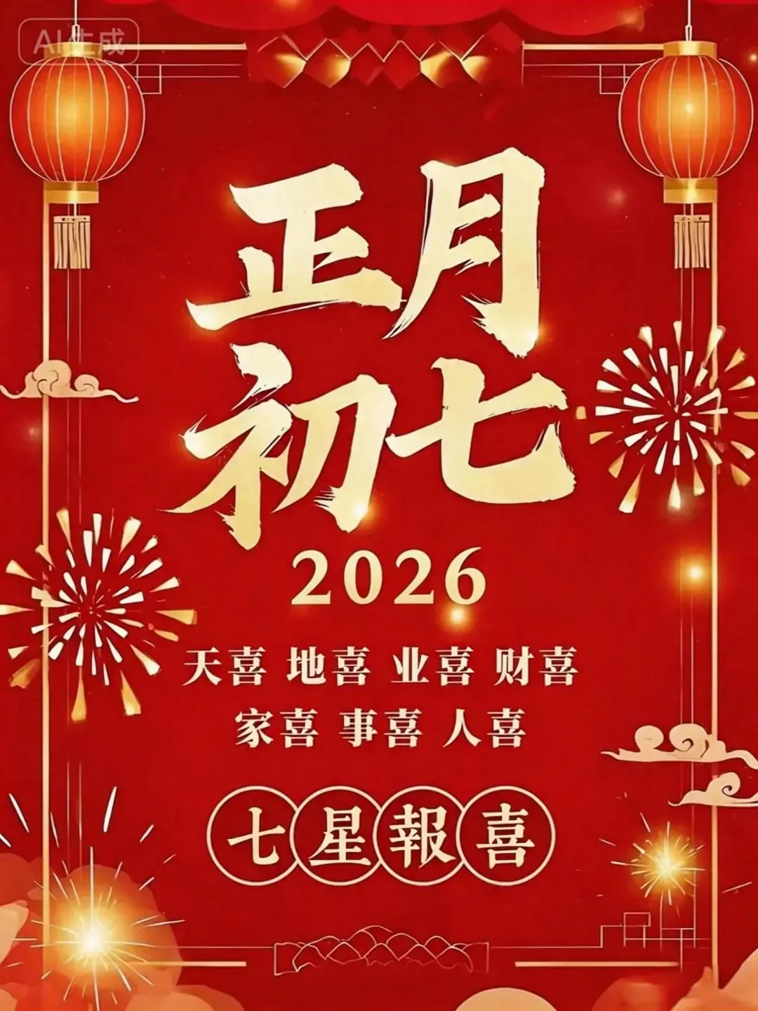 初七喜事多,红红火火乐不休。好运连连福满门,桃花盛开喜相随。幸福如意人心乐,事业顺利一帆风。大年初七美好至,快乐幸福更上层。