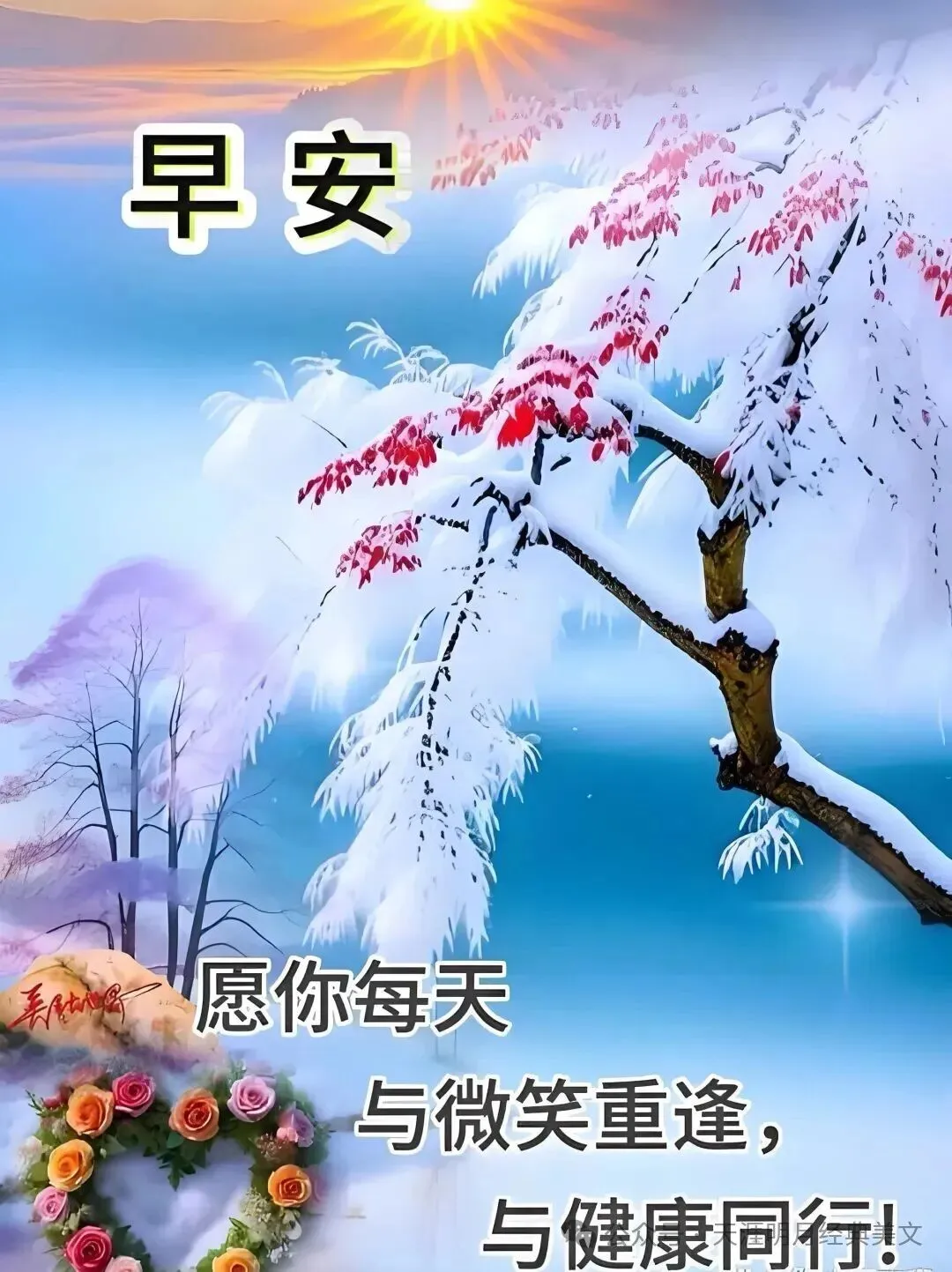 13、🌞早上好,月缓缓前行,情意深深留存,腊月寒意浓,情谊暖心中。深深情谊已珍藏,🌺用微笑点缀梦想,祝福悄悄来送上,🍀提醒一句记得添衣裳,腊月保暖,福寿绵长。雪花飞,雪花舞,🌞愿你永远快乐!朋友们早安!🌞