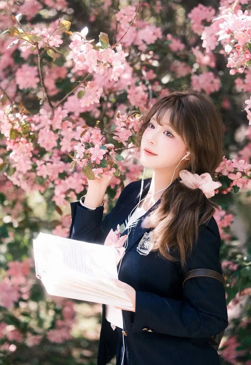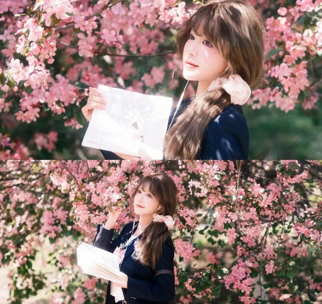 此刻,她正站在盛开的樱花树下,双手轻轻捧着一枝樱花,凑近鼻尖,微微仰头,闭着眼睛,深深地吸着气,仿佛在细细品味着樱花的芬芳。她的表情宁静而陶醉,嘴角微微上扬,露出一抹淡淡的微笑,仿佛所有的烦恼都在这一刻烟消云散。阳光透过樱花的缝隙洒在她的脸上,形成一片片斑驳的光影,让她的肌肤显得更加白皙透亮,如同樱花花瓣般娇嫩。樱花,是春日的使者,是浪漫的象征。它们在枝头肆意绽放,一团团、一簇簇,如云似霞。粉色的花瓣层层叠叠,如同少女的心事,细腻而柔软。微风拂过,花瓣纷纷扬扬地飘落,如同粉色的雨滴,洒在少女的头发上、肩膀上,为她披上了一层梦幻的纱衣。这满树的樱花,仿佛是大自然为她搭建的舞台,让她在这粉色的世界里尽情绽放自己的美丽。对于少女来说,这或许是一个平凡而又珍贵的春日午后。她可能刚刚结束了一堂课,趁着课余时间,来到这樱花树下,享受这片刻的悠闲。校园里的生活,总是充满了忙碌与压力,而这一片樱花树,就像是她的秘密花园,是她释放压力、寻找自我的地方。在这里,她可以暂时忘却学习的烦恼,沉浸在大自然的怀抱中,感受着生命的美好与活力。