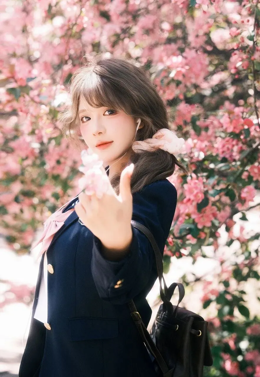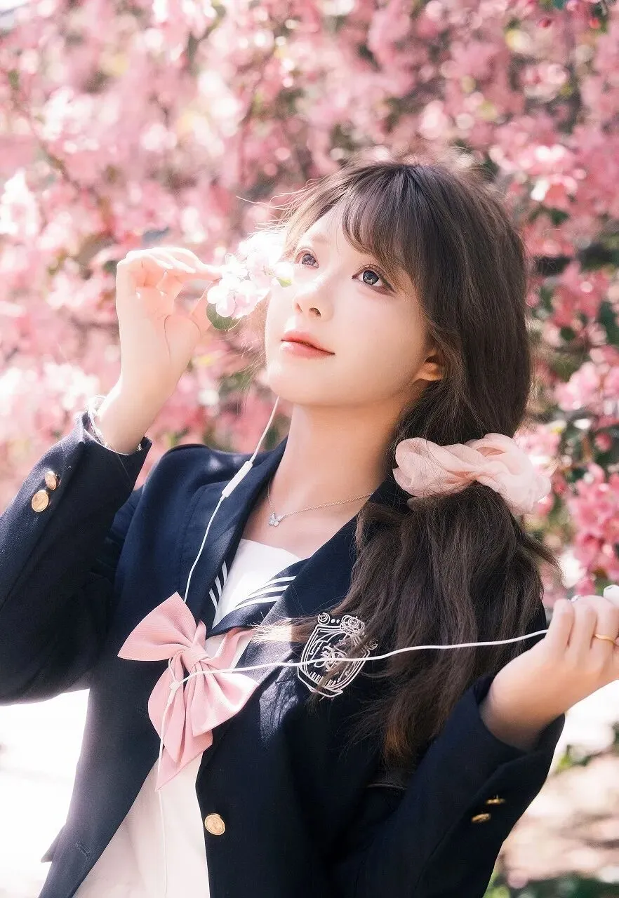 春日,是一场盛大的花事,是大地苏醒后谱写的浪漫诗篇。当微风轻拂,粉色的樱花如雪花般飘落,整个世界都被染上了温柔的色彩。在这如梦如幻的樱花雨中,一位身着制服的少女宛如从画中走来的精灵,成为了这春日里最动人的风景。她穿着一件深蓝色的制服外套,金色的纽扣在阳光的照耀下闪烁着耀眼的光芒,仿佛是镶嵌在夜空中的星星。外套上精致的校徽,诉说着青春的故事,承载着校园里的欢笑与梦想。内搭的白色水手服,纯净而美好,与深蓝色的外套形成鲜明的对比,宛如蓝天与白云的完美搭配。领口处,一个大大的粉色蝴蝶结娇艳欲滴,为整体造型增添了一抹甜美的气息,仿佛是樱花树上最娇嫩的花朵。她的头发被扎成了低马尾,发尾微微卷曲,如同波浪般轻柔。一个粉色的纱质发圈将头发束起,与领口的蝴蝶结相呼应,更显少女的温柔与俏皮。几缕发丝随风飘动,轻轻拂过她的脸庞,为她增添了一份灵动与自然。她的耳朵上挂着白色的耳机线,手中似乎握着音乐播放器,也许正沉浸在悠扬的旋律中,享受着这片刻的宁静与美好。
