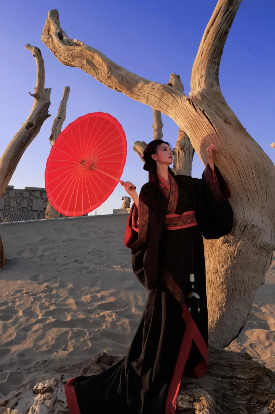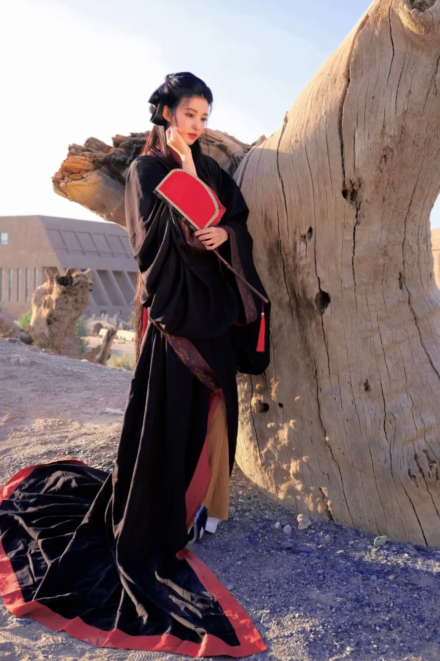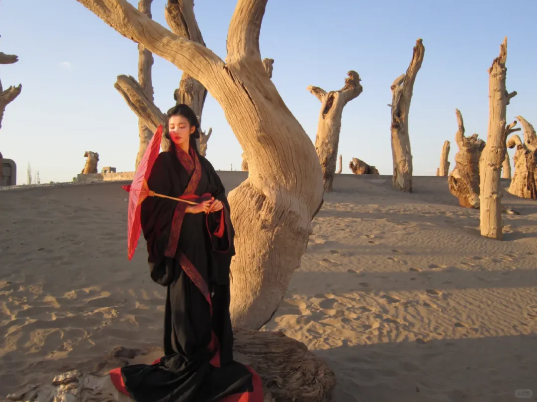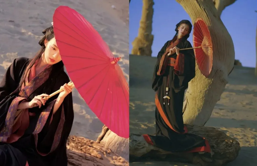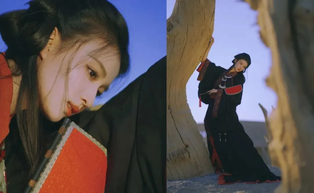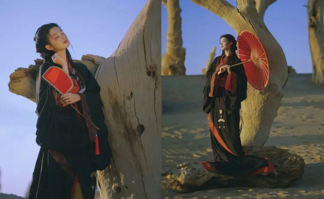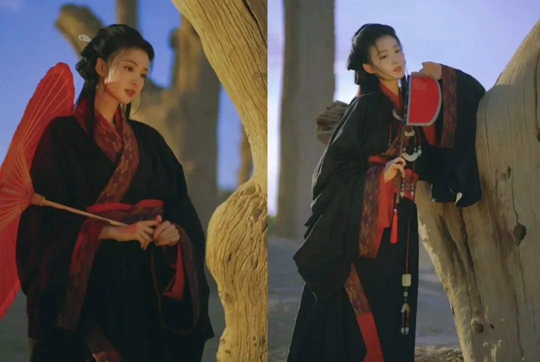 王楚然这身“战国袍”主打红黑配色,偏向庄重风格,纹饰也多为先秦纹样,另外腰佩玉组佩,也是礼仪的象征,拍摄背景在西北胡杨林,宽阔的场景营造出一种宿命感。