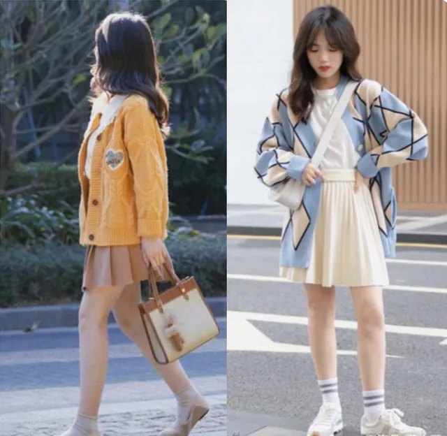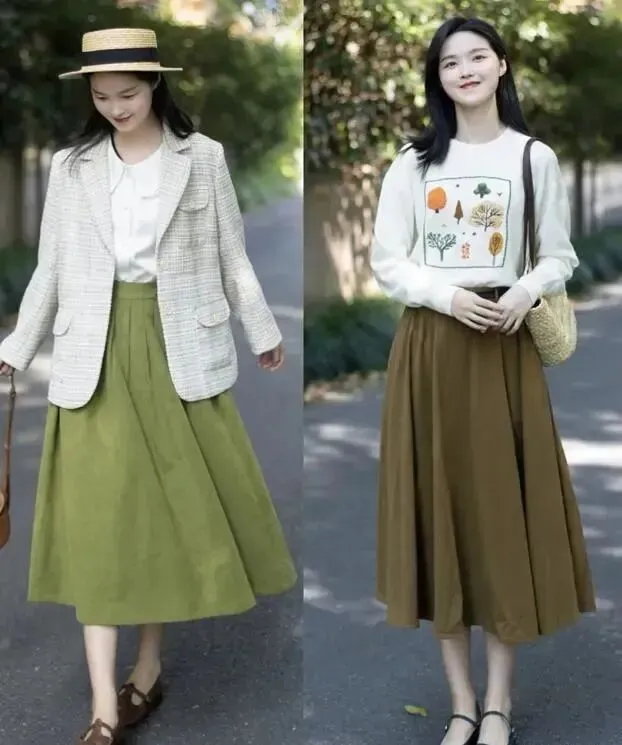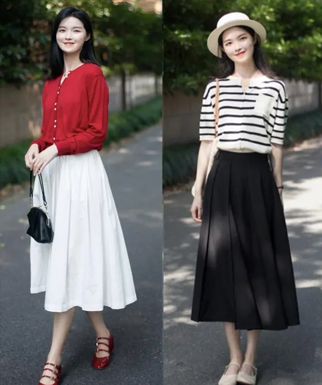 如果不想穿裤子,则可以考虑选择一款高腰设计的半身长裙,适中的长度,也能轻松提高腰线,打造大长腿的即视感,让矮个子女生也可以穿出高挑身材。如简单的修身上衣配上高腰的百褶裙或A字裙,并将上衣下摆放进裙装中,能很好的修饰腰线,也有时尚的感觉,特别显气质。
