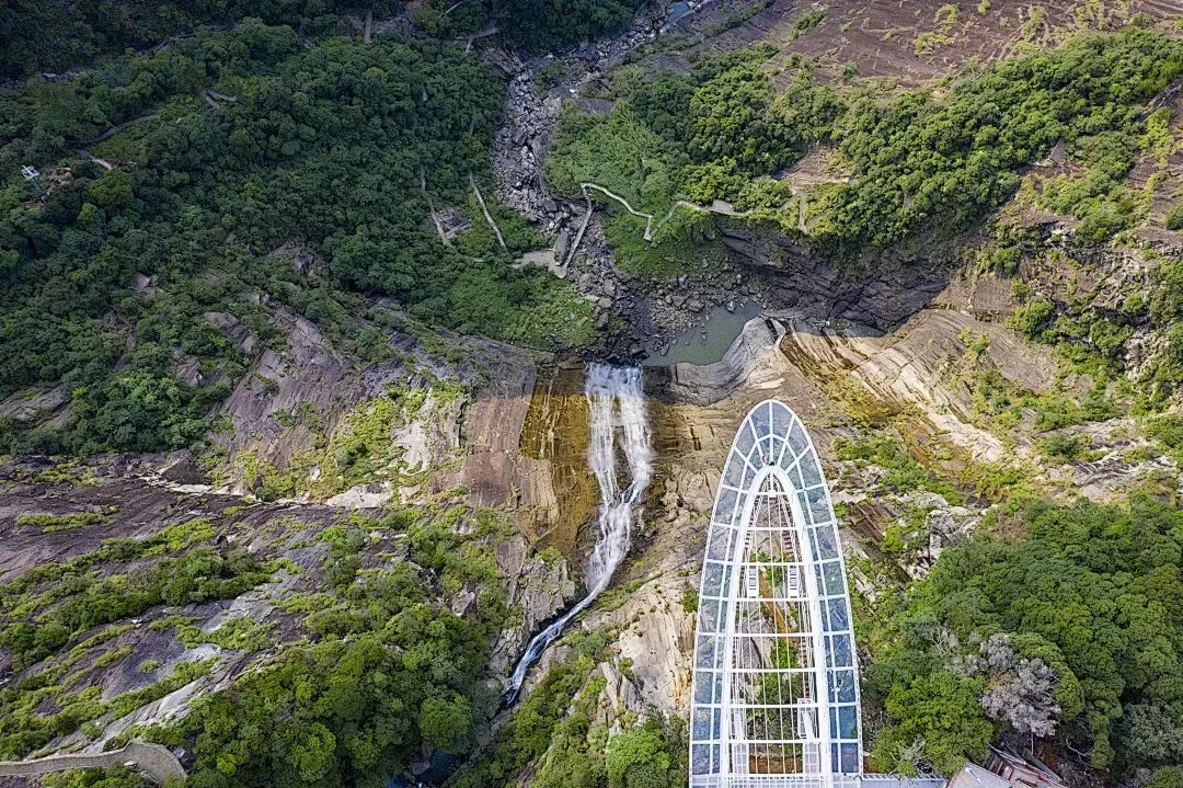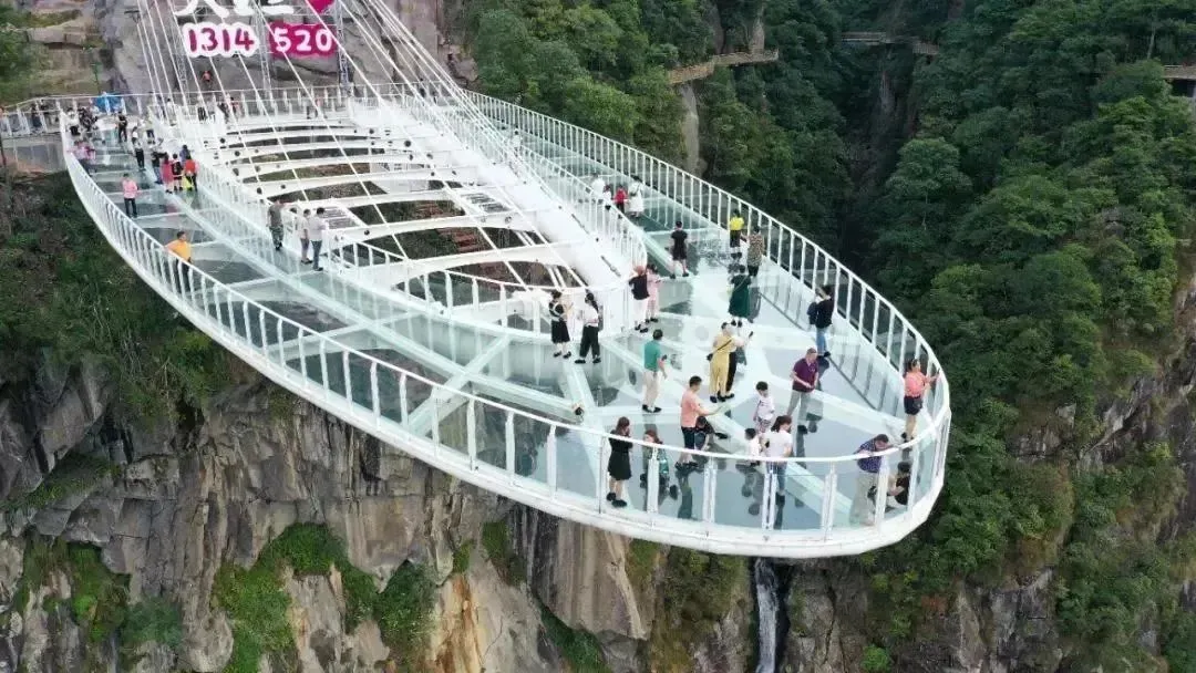 悬空高度314米,下面是深不见底的悬崖峭壁和奔腾而下的瀑布,是景区的网红打卡点和爱情圣地。